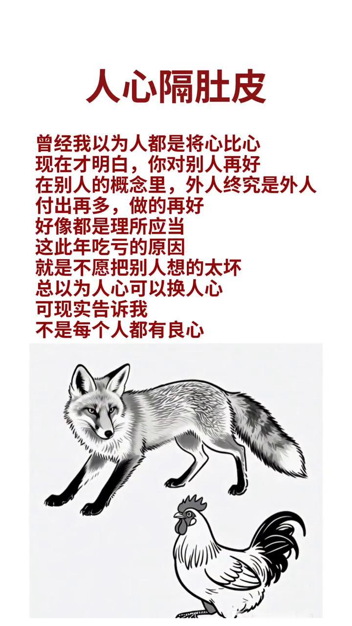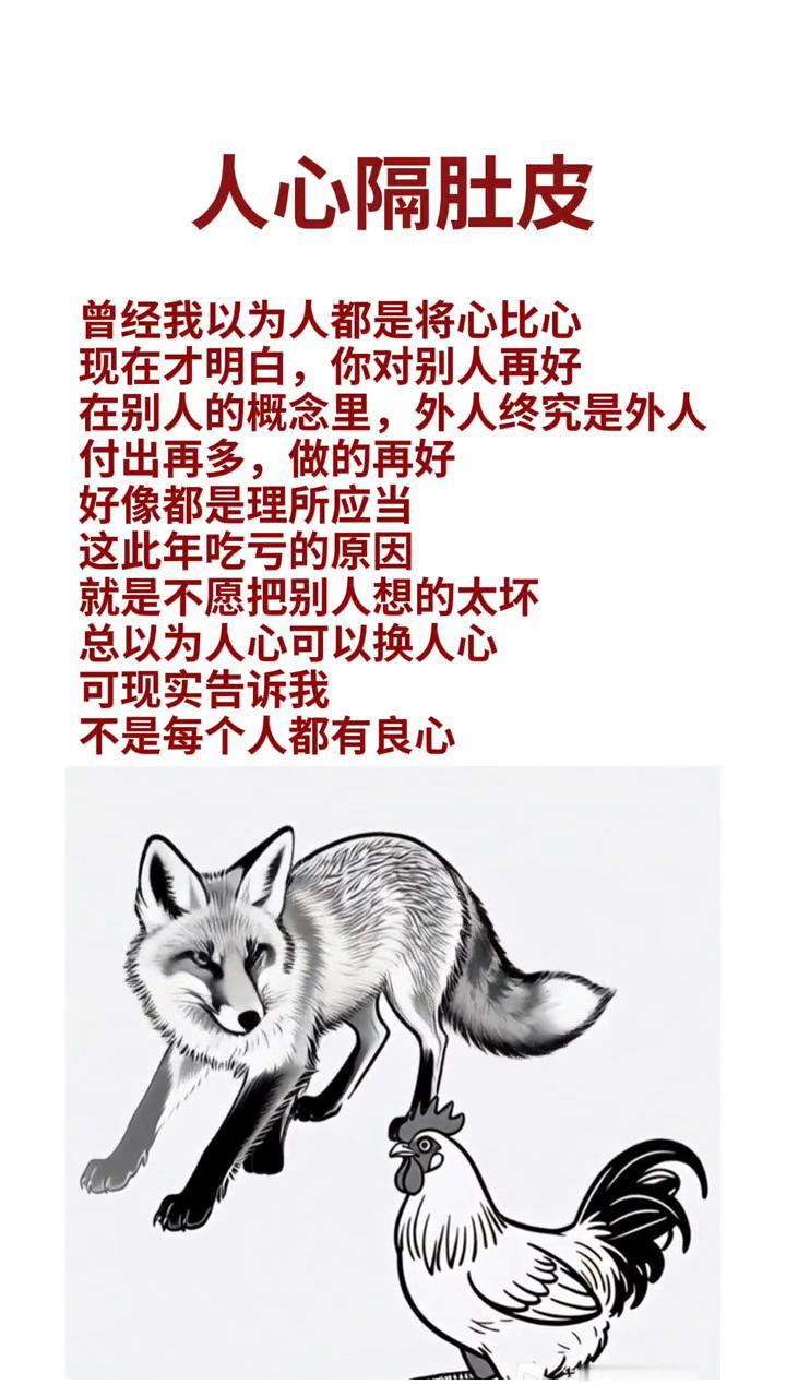 人心隔肚皮。 曾经我以为人都是将心比心,现在才明白,你对别人再好,在别人的概念里,外人终究是外人。付出再多,做的再好,好像都是理所应当。这此年吃亏的原因,就是不愿把别人想的太坏。总以为人心可以换人心,可现实告诉我,不是每个人都有良心。