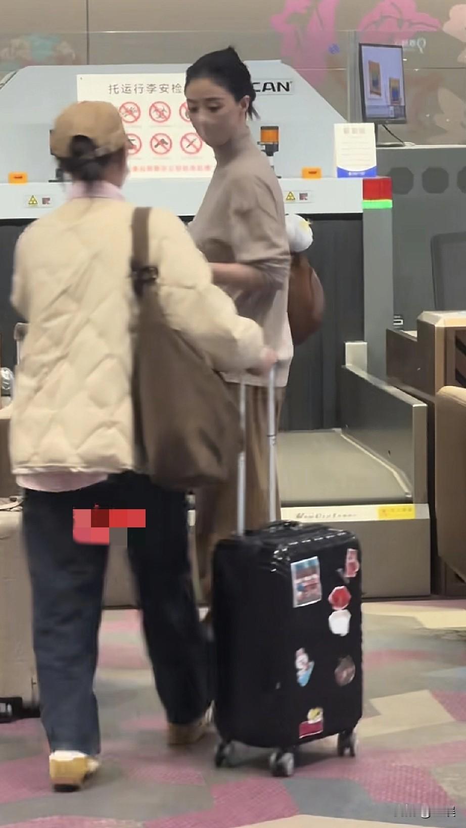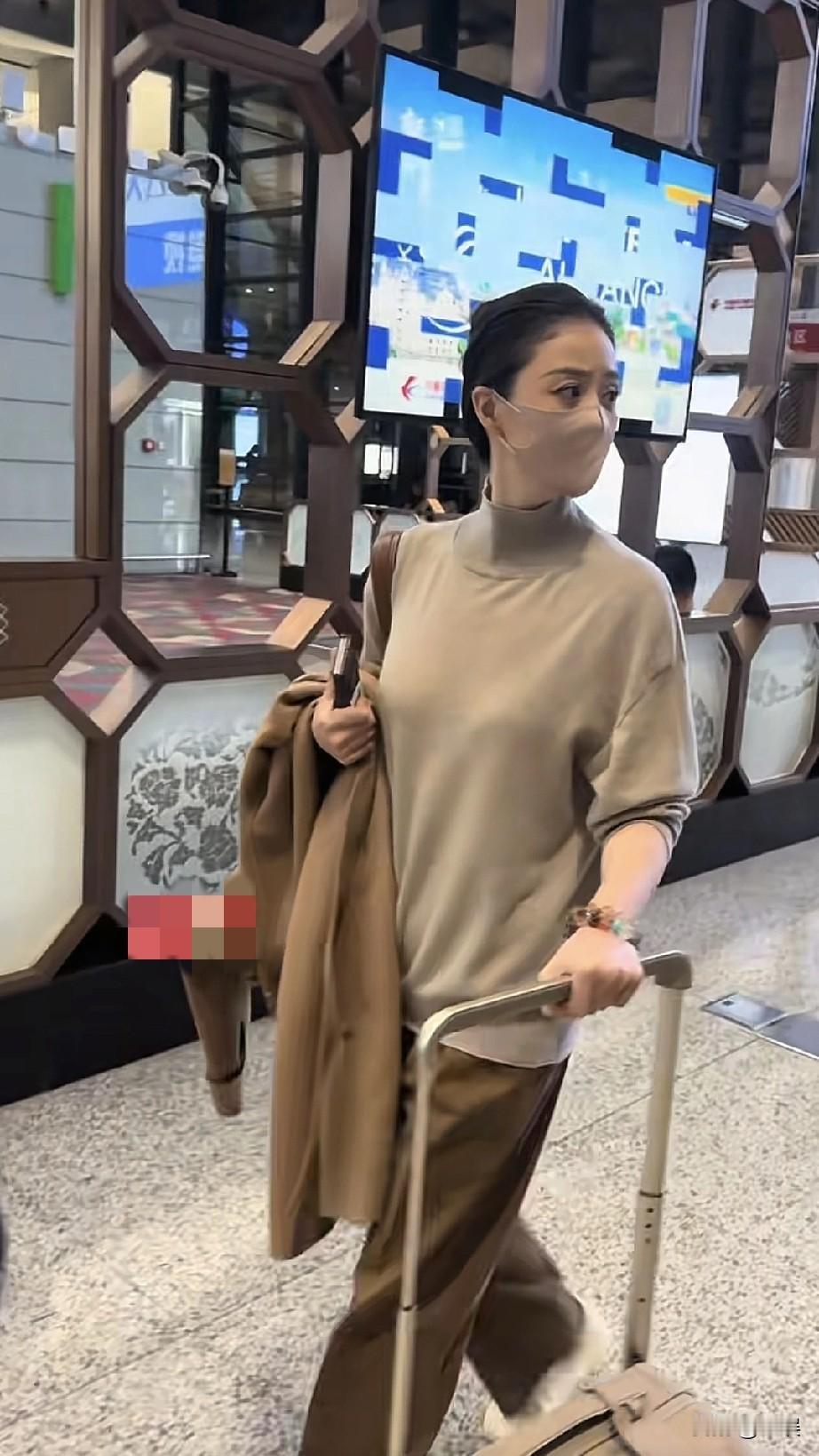 蒋欣机场浅棕色高领针织衫,搭配同色系下装,整体风格简约大气