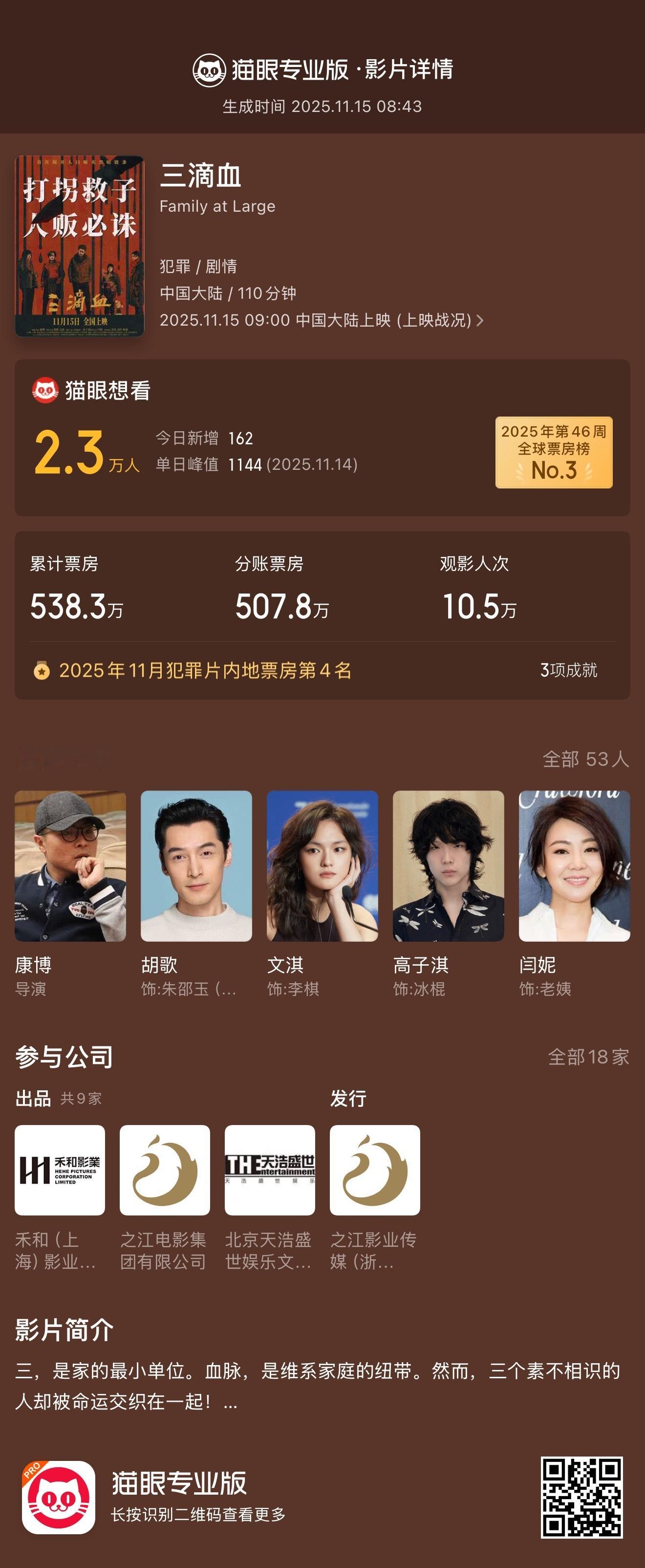 据猫眼专业版云包场显示, 包场支持胡歌主演电影《三滴血》,影片已于今日正式上映,截至当前影片累计票房已超538.3万。