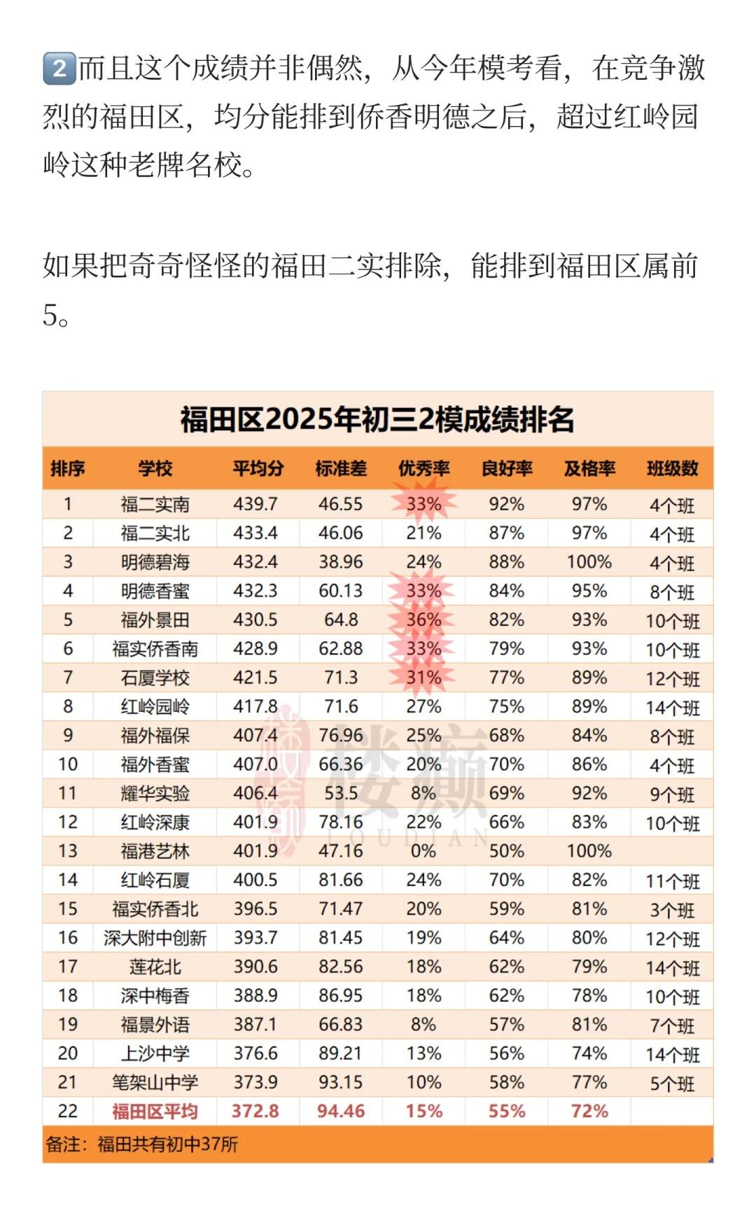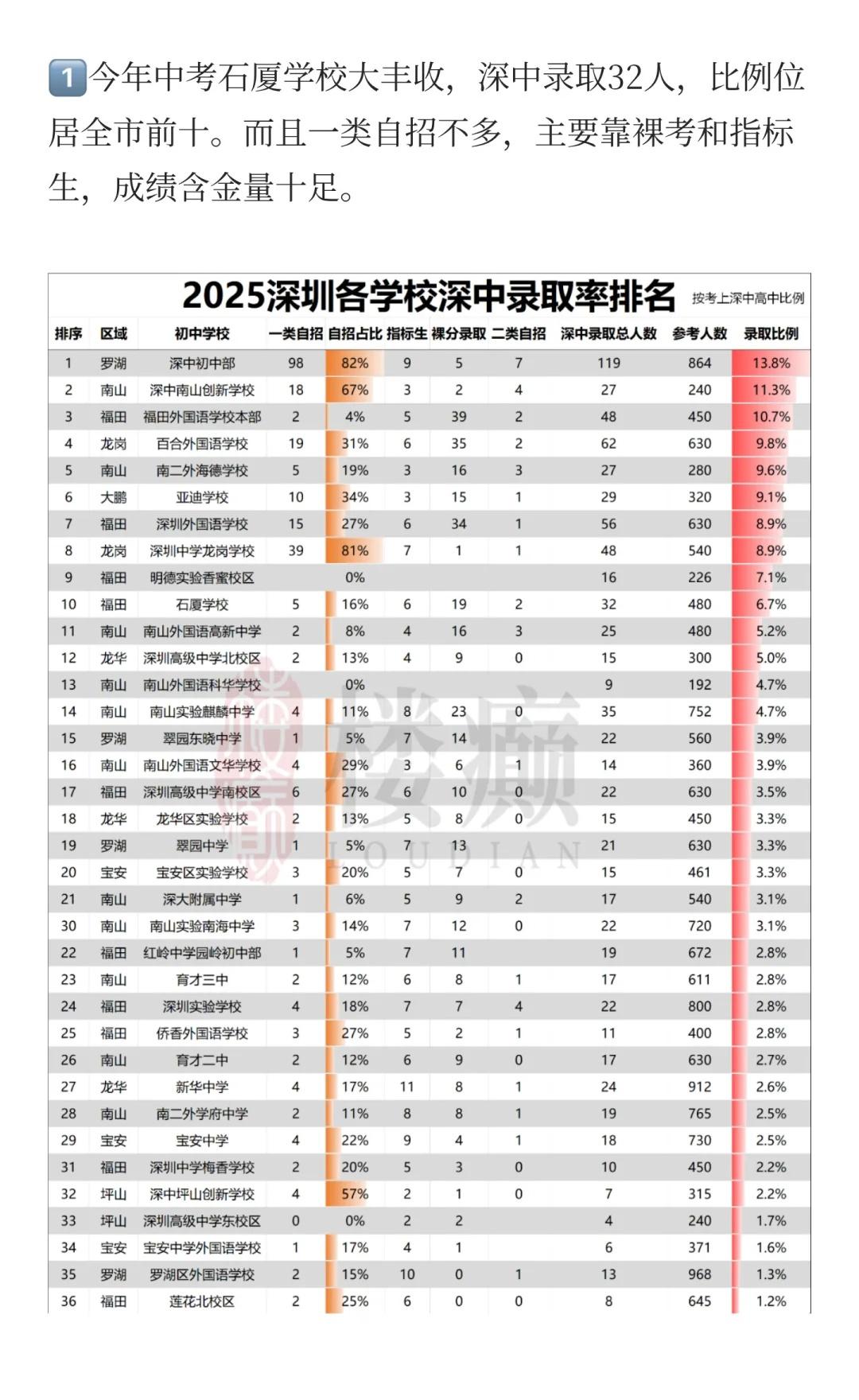 石厦学校怎么突然这么猛了! 1️⃣今年中考石厦学校大丰收,深中录取32人,比例位居全市前十。而且一类自招不多,主要靠裸考实力。 2️⃣而且从今年模考看,在竞争激烈的福田区,均分能排到侨香明德之后,超过红岭园岭这种老牌名校。 3️⃣石厦学区的积分也比较高,今年小一84分,初中积分看历史也都在80分以上,租房没戏。 4️⃣石厦学区紧挨着购物公园,学区基本都是次新房,周边配套齐全,既有改善的中心区四大神盘,也有300万的小户型。 🌈大家愿意在福田石厦学区安家吗? 深圳中考 深圳幼升小 深圳小升初 深圳小学 深圳初中 深圳四大名校 深圳上学 深圳积分入学 深圳学区