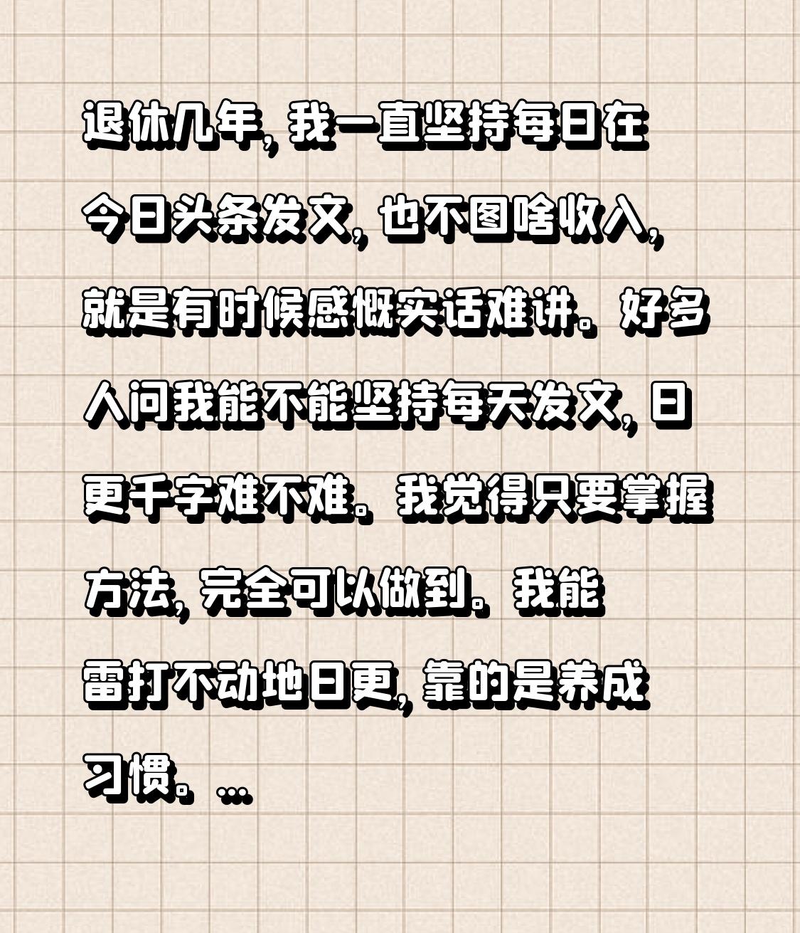 退休几年,我一直坚持每日在今日头条发文,也不图啥收入,就是有时候感慨实话难讲。好多人问我能不能坚持每天发文,日更千字难不难。我觉得只要掌握方法,完全可以做到。 我能雷打不动地日更,靠的是养成习惯。早起一小时写作,别人刷手机的时候我在码字。而且内容质量得有保证,每篇文章我都打磨三遍以上。和读者互动也很重要,留言必回、问题必答。我还会分析后台数据,总结爆款规律。坚持带来了复利效应,我从无人问津到日更破万粉只用了半年,现在自然流量占比超80%。