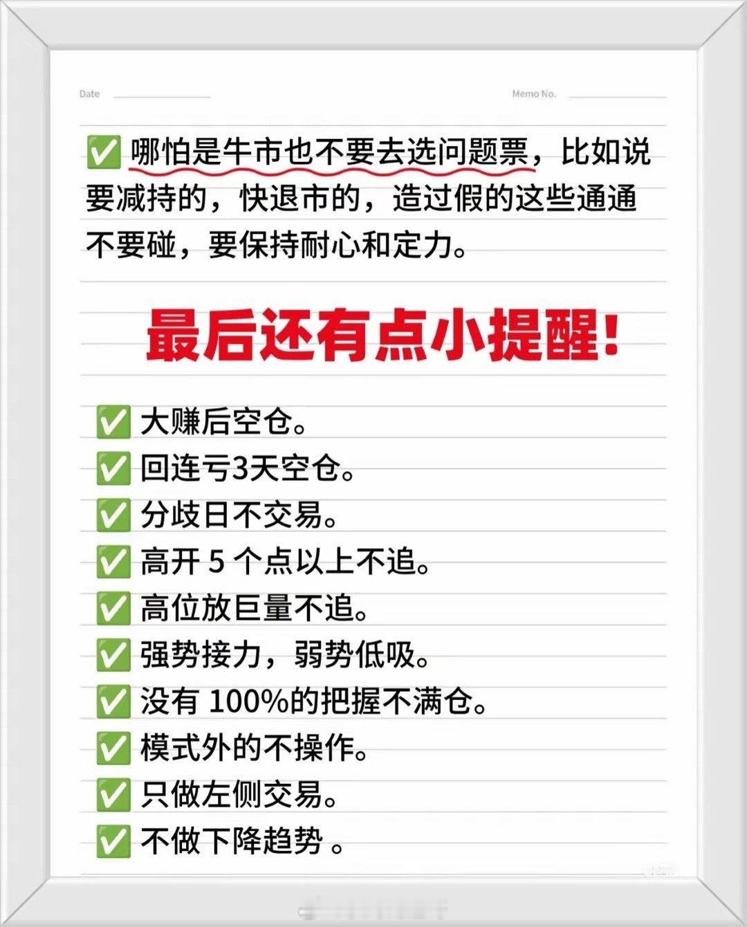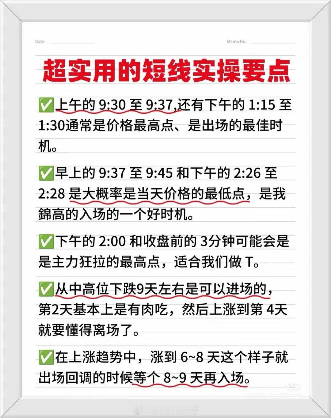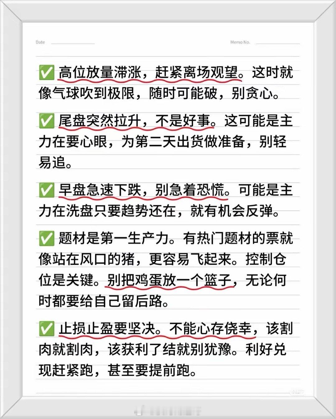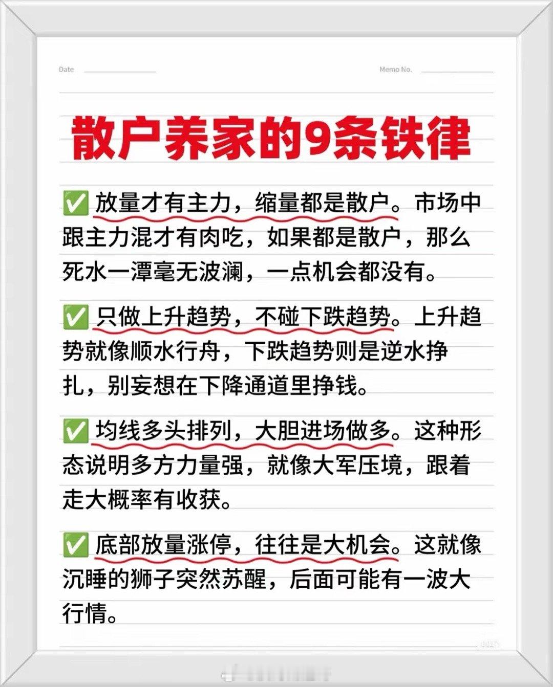 炒股核心知识与实战铁律总结收藏研究学习!!!一、基础规律与信号识别1. 分时走势信号- 吸筹/出货信号:- 早间低开下午大涨→吸筹;早间高开下午大跌→出货。- 上午拉高下午回落→洗盘;高位小涨小跌突然放量长阴→出货。- 量价关系:- 缩量上涨会涨,缩量下跌会跌;放量滞涨→顶部信号;缩量不跌→底部信号。- 巨量急涨必然回调;低位横盘再放量→上涨概率大。2. 趋势与主力行为- 主力动向:尾盘突然拉升可能是为次日出货铺垫;早盘急跌或为主力洗盘(趋势未破则反弹机会大)。- 趋势原则:只做上升趋势,不碰下跌趋势(顺水行舟 vs 逆水挣扎)。二、关键操作策略1. 买卖时机(短线实操要点)- 出场时机:上午9:30-9:37、下午1:15-1:30(通常为价格高点)。- 入场时机:上午9:37-9:45、下午2:26-2:28(大概率是当日低点)。- 做T时机:下午2:00及收盘前3分钟(主力可能拉升最高点)。- 周期规律:- 中高位下跌9天后可进场,次日获利,上涨第4天离场;- 上涨趋势中涨至6-8天出场,回调8-9天后重新入场。2. 特殊形态机会- 底部放量涨停:可能是大行情起点(沉睡的狮子苏醒)。- 均线多头排列:多方力量强,大胆进场(大军压境形态)。三、风险规避与纪律1. 必须远离的股票:- 即使牛市也要避开问题股(减持、退市、财务造假等),保持耐心和定力。2. 十大操作纪律(小提醒!)- 仓位管理:大赚后空仓;连续亏损3天强制空仓;无100%把握不满仓。- 交易策略:- 股价高开5%以上不追;高位放巨量不追;优先强势股接力,弱势股低吸。- 只做左侧交易(低位买入),不参与下降趋势的股票。- 市场环境:市场分歧日(多空激烈博弈时)不交易。- 模式专注:只操作自己熟悉的模式,拒绝模式外机会。四、核心口诀速记- 量价口诀:缩量涨→继续涨,缩量跌→继续跌;放量滞涨→跑,缩量不跌→等。- 趋势口诀:上升趋势顺水推舟,下跌趋势逆水行舟。- 操作口诀:高位不贪(气球理论)、急跌不慌(洗盘可能)、题材为王(风口猪飞)。总结建议1. 优先关注信号:量价关系(放量/缩量)、分时走势(早盘/尾盘异动)、周期规律(下跌9天/上涨6-8天)。2. 严格纪律:止损止盈果断,避免情绪化交易(如高开追涨、亏损硬扛)。3. 长期生存关键:只做确定性机会(上升趋势、主力介入明显),避开高风险标的(问题股、下降趋势)。按此体系执行,可显著提升散户在复杂市场中的生存与盈利概率! 📈