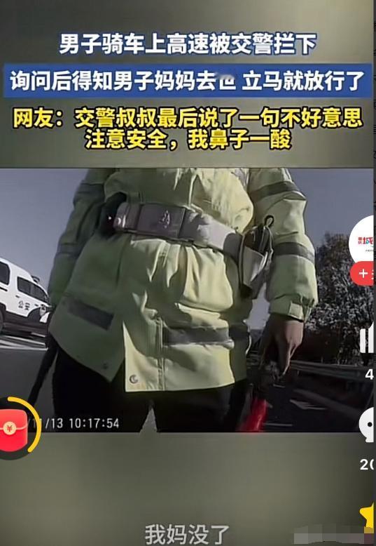 “没忍住看哭了”!北京,一位妈妈突然离世,男子着急骑摩托车上了环路,不料被执勤交警抓住,男子一句话:“我妈没了,我想看我妈,不是想超车”,交警得知情况后暖心放行,并道歉安慰“节哀师傅,刚才不好意思,耽误您了”…… 交警执法是严苛的,更是暖心的!正所谓“天大,地大,不如母亲伟大”为这样执法有温度的交警点赞! "母亲去世男子赶路被放行"撕开执法冰冷假面!防疫卡口查通行证却放行悲痛者,暴露规则与人性的终极博弈——当"程序正义"撞上"生死时速",民警用温度融化制度铁幕,这记人性化执法才是真正的法治文明! 拦你是为法,放你是为情,法外还是有人情的!男子哭着说妈没了那一刻破防了,交警的体谅太戳心,温暖从不缺席!