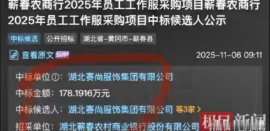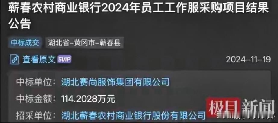 银行一年200万的服装费?走的是正规流程还是中饱私囊了? 一边是100万元的监管罚单,一边是近180万元的新行服采购——湖北蕲春农商行的操作,让公众看得一头雾水。在信贷管理不审慎、员工行为管理不到位的整改关键期,该行优先砸钱换行头的选择,实在难言合理。 事件的核心争议很明确:去年11月刚花费114万余元采购过员工行服,时隔仅一年,蕲春农商行便再次启动招标,最终以178.1916万元的价格敲定新一批四季行服。按489名员工计算,人均一套行服高达3644元,一年之内两套行服的人均支出已超6000元。 银行统一着装展示服务形象,本是行业常规操作,公众并无异议。但“常规”的前提是合理适度——刚满一年的旧行服大概率仍能正常穿着,既无破损过时的困扰,也不存在功能升级的迫切需求,此时耗费近180万元重复采购,难免让人质疑其资金使用的优先级。要知道,该行刚在10月因信贷管理、员工行为管理等问题被监管部门处以100万元罚款,这笔罚款背后,本应是查漏补缺、强化内控的整改投入,而非将资金倾斜于非必要的“形象工程”。 更值得玩味的是面对媒体追问的态度。当记者就采购事宜寻求回应时,该行工作人员以“金融机构不接受媒体采访”为由拒绝沟通。作为服务公众的金融机构,其运营资金本质上与储户信任、市场环境紧密相关,对于公众关切的大额支出问题,理应主动作出说明,而非用一句冰冷的拒绝回避质疑。这种“花钱大方、回应吝啬”的反差,更让重复采购的合理性打上了问号。 金融机构的核心竞争力,从来不是昂贵的行服,而是稳健的经营管理、合规的业务操作和贴心的客户服务。蕲春农商行与其耗费巨资在“穿衣打扮”上做文章,不如将资金用在刀刃上——弥补信贷管理漏洞、提升员工专业素养、优化服务流程,这些才是真正能赢得公众信任、筑牢发展根基的关键。希望该行能正视公众质疑,公开采购决策的合理性,同时反思资金使用逻辑,让每一笔支出都经得起监督与推敲。