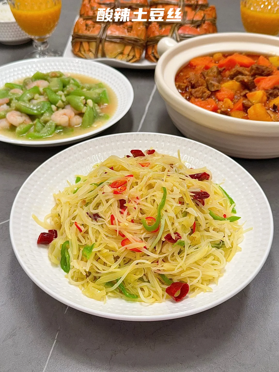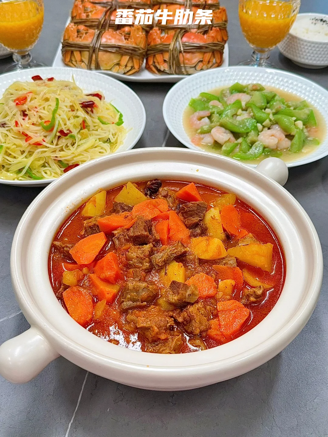 呜呜呜~今天的晚餐又被全家人扫光了 简单快手零失败,吃货的快乐就是这么简单!! 🌈今日美食分享: ❶【清蒸大闸蟹】 ❷【番茄牛肋条】 ❸【丝瓜炒虾仁】 ❹【酸辣土豆丝】 秋天的肥蟹🦀️,满满的蟹黄真的要流口水了。清蒸才是对螃蟹最大的尊重,原汁原味鲜到掉眉毛啦! 番茄牛肋条我家也经常做,番茄炖得烂烂的,汁水完全融进肉里,牛肋条软烂入味,一口肉一口汤,连干三碗饭都不够🍚 一桌菜有蟹有肉有蔬菜,营养均衡又美味,再忙也要好好吃饭呀💕