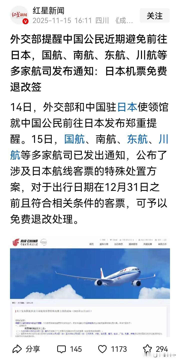 这样很不错,中国的耐心是有限的,对日本的反制是必要的,而且相应的因为爱国付出的成本,不是由普通民众承担! 在外交部提醒大家近期避免前往日本后,国航、南航、东航、川航等多家航空公司相继发出通知,公布了涉及日本航线客票的特殊处置方案,对于出行日期在12月31日之前且符合相关条件的客票,可予以免费退改处理。 这是航空公司跟进国家的号召行动! 假如不是免费退改签,很多人在行程已经提前确定的情况下,即使在现在高市“搞事”,中日人文交流氛围已经恶化的情况下,考虑到因为退票改签造成的经济损失,可能还是只得硬着头皮去一趟日本。 这是告诉大家,你响应国家号召,反制日本,国家也不会让你冒着没必要的损失去爱国! 这就像二战的时候,英国首相丘吉尔告诉民众,现在是战时,德军炸坏的房子没法修,因为修好了又会被炸,但是,打赢德国后,国家都会把这些被炸坏的房子修建好! 日本对华态度