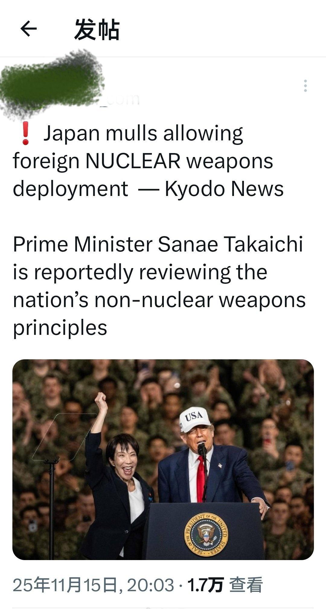日本考虑允许外国部署核武器——共同社报道 据报道,首相高市早苗正在审查该国的“不