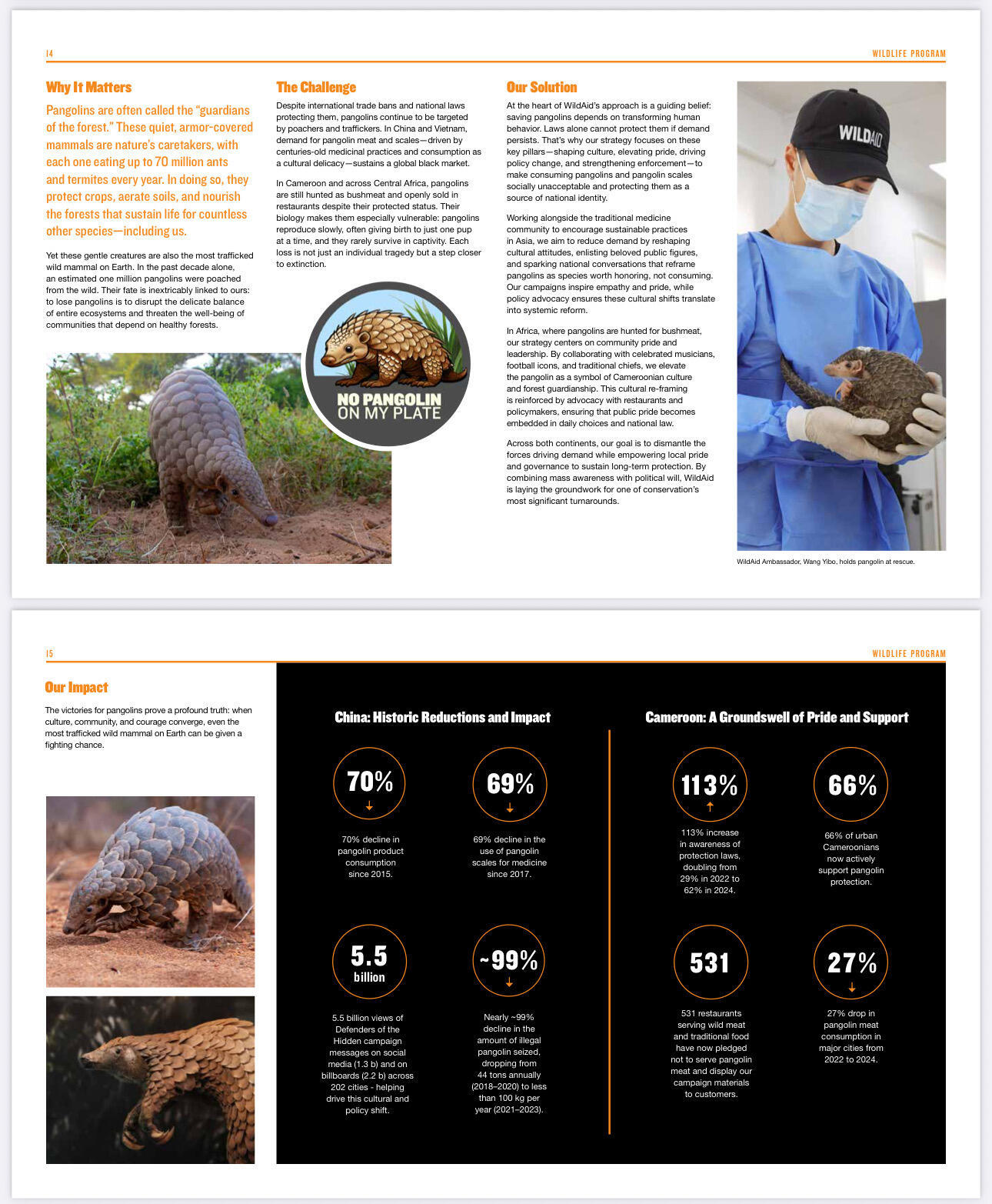 WildAid世界野生救援组织发布了《24/25年度影响力报告》。 穿三甲篇章中王一博被誉为“深受喜爱的公众人物”,王一博的纪录片引发全国范围内关于穿山甲作为一种值得保护而非食用的物种的讨论,穿山甲制品的需求量下降了70%。王一博真的一直在行善事、积善果,是个很好的人