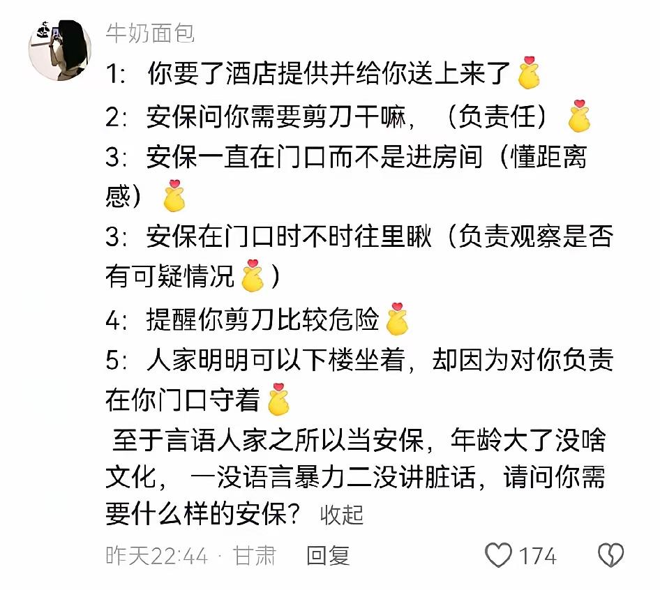 兰州文旅被整的很无奈! 每个规定背后都有血的教训! 双方的逻辑思维没在同一个频道上,认知不同,导致的结果就可想而知了! 人是怕你用剪刀自残,守在门口,说用完了保安就拿回去,小仙女挺会给自己加戏的。 兰州文旅被整的很无奈!