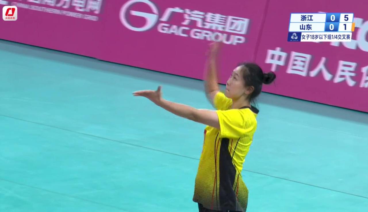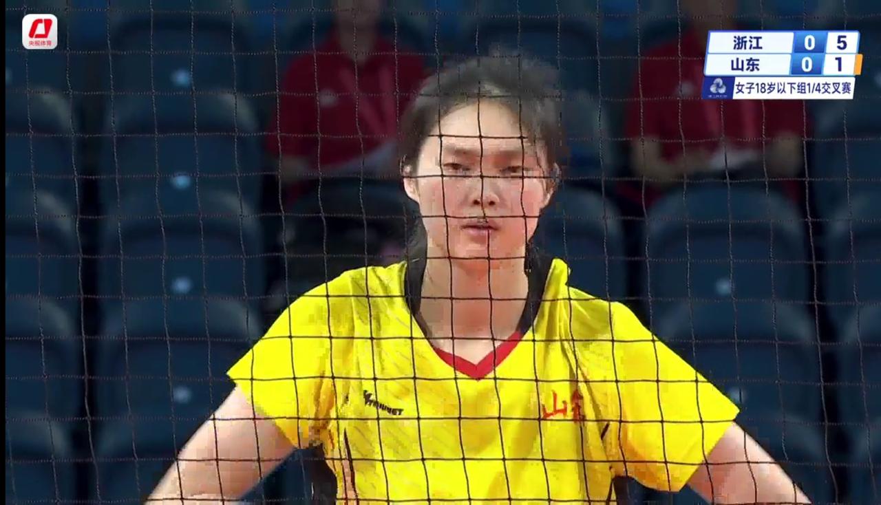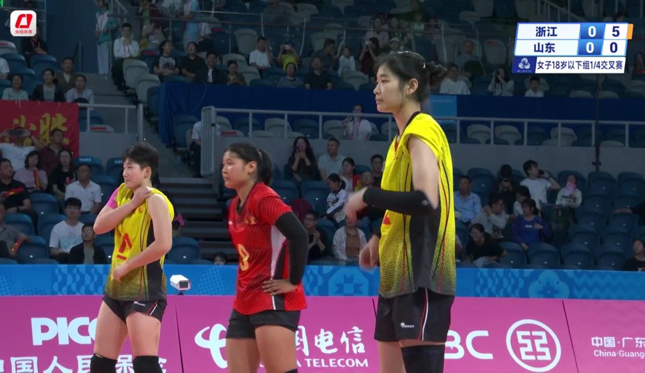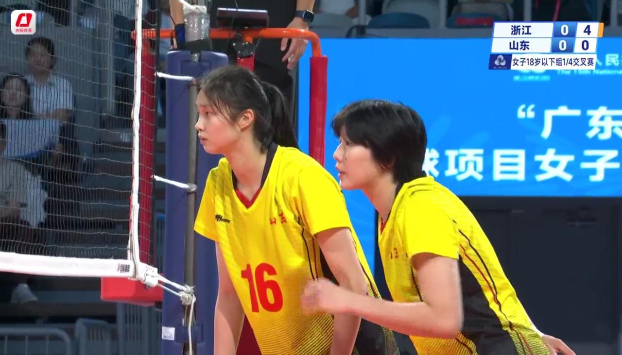 [U18女排全运会]1/4决赛:山东——浙江 实时战况: 16日下午13:30分,全运会U18女排半决赛第山东——浙江的比赛开始。第—局,3:0,浙江领先,山东暂停。4:0,5:2,7:2,8:2,8:3,山东吊球。9:3,浙江扣球。9:4,山东快攻。9:5,山东打手出界。10:5,浙江快攻。10:6,山东扣直线。11:6,12:6,浙江快攻。12:7,浙江发球出界。12:8,山东拦网。12:9,山东打手出界,浙江暂停。13:9,浙江扣球。14:9,浙江扣球。14:10,山东打手出界。15:10,浙江快攻。16:10,山东第二次暂停。16:11,17:11,浙江扣球得分。17:12,17:13,山东快攻。18:13,山东发球出界。18:14,山东快攻。18:15,山东打探头,浙江暂停。18:16,山东拦网得分。19:16,浙江快攻。20:16,浙江发球。21:16,山东落谷。21:17,山东拦网。21:18,22:18,22:19,山东扣球得分。.23:19,山东扣球出界。23:20,山东快攻。23:21,23:22,浙江扣出界外。23平,山东拦网,追平比分。 24:23,24平,25:24,26:24,浙江拦网得分,胜第一局,大比分1:0,浙江领先! 第二局比赛正在进行中……