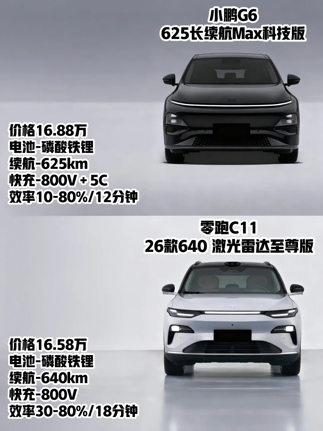 ✔️小鹏G6 625长续航Max科技版(入门款)16.88万,零跑C11 26款640激光雷达至尊版(顶配)16.58万,相差3000块。