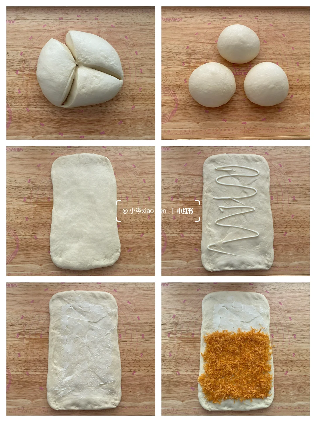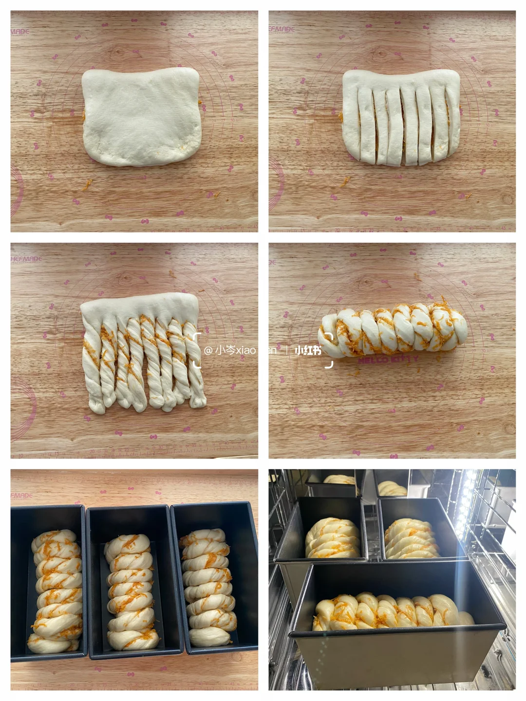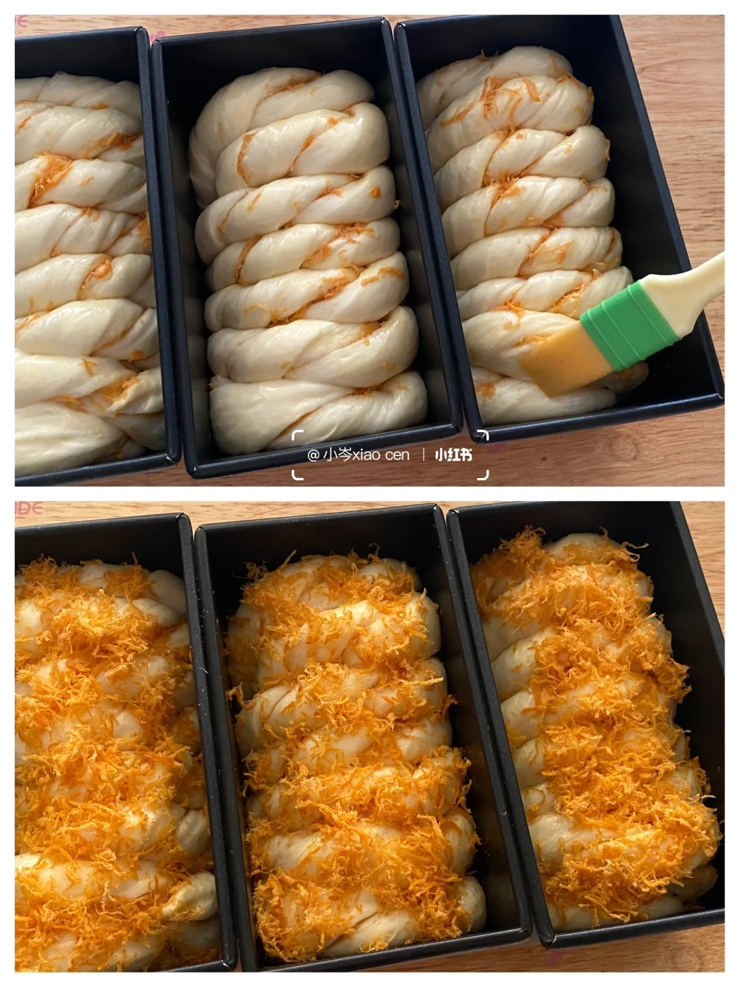 7.翻面,涂抹沙拉酱,撒上肉松,上下折叠,切成8条,上边留2厘米宽,分别卷成麻花状,从上至下卷起来,放入450g吐司模具中。