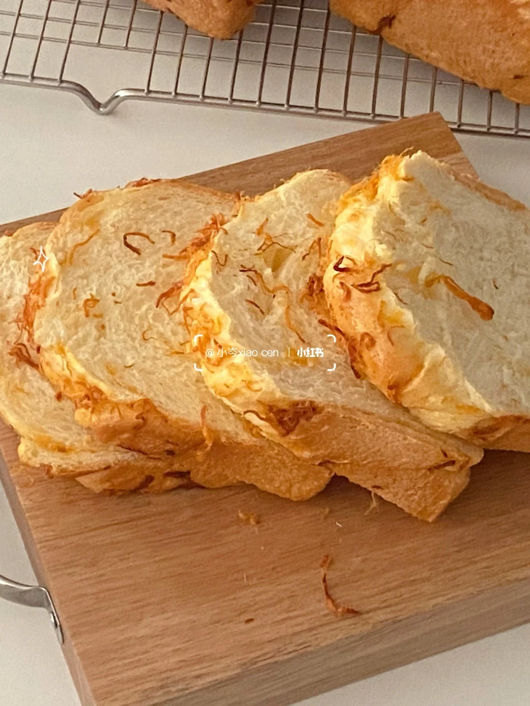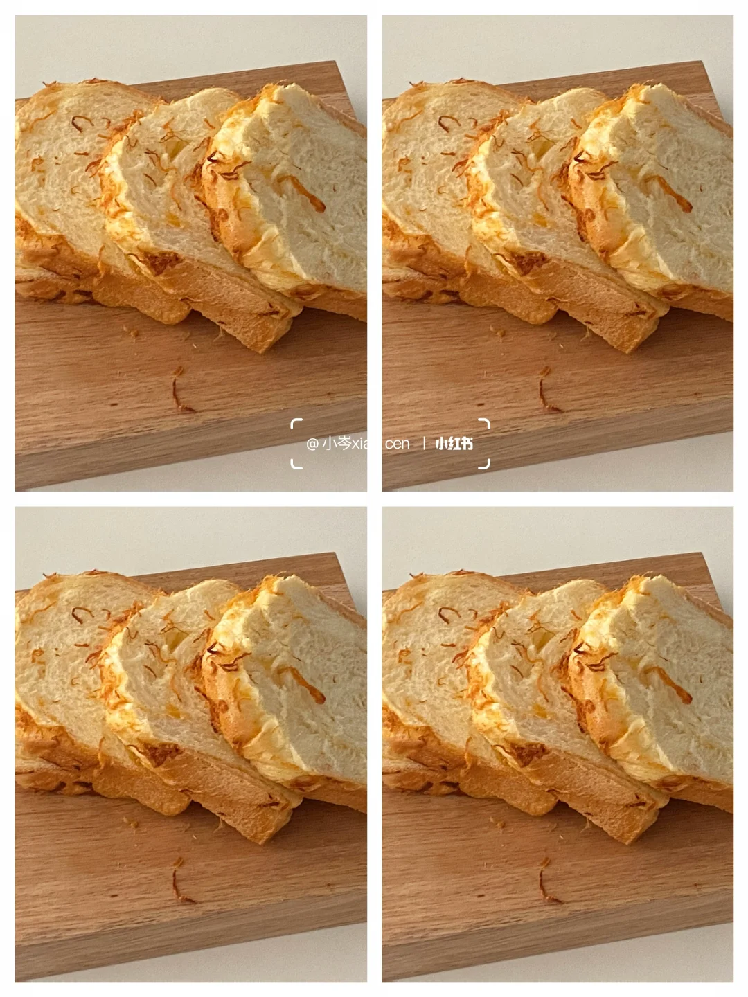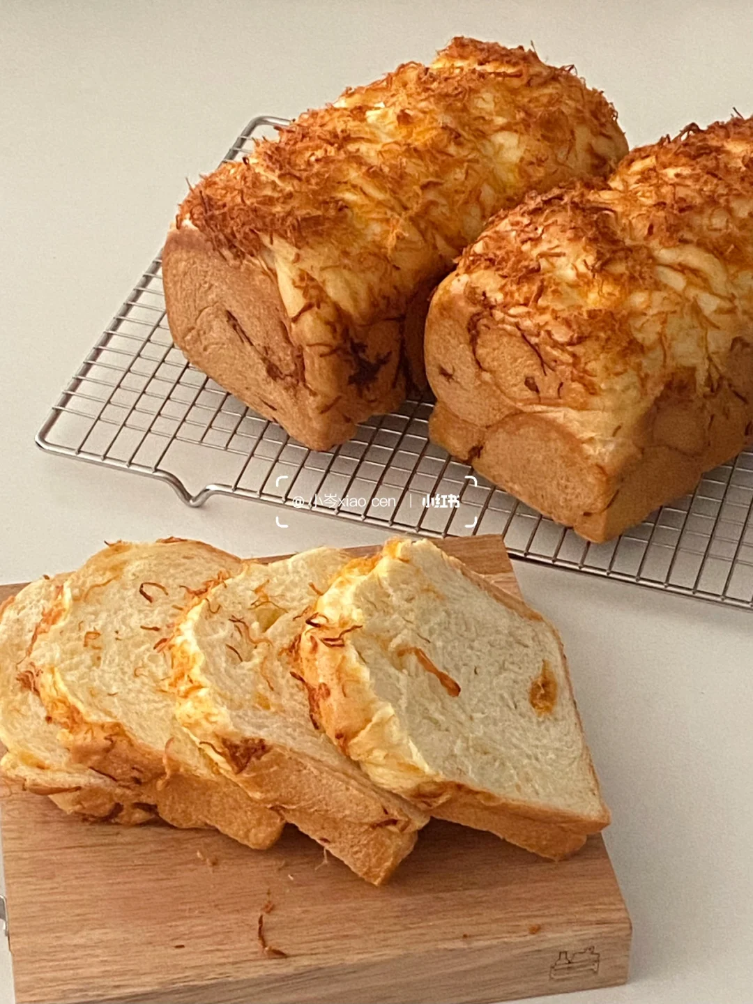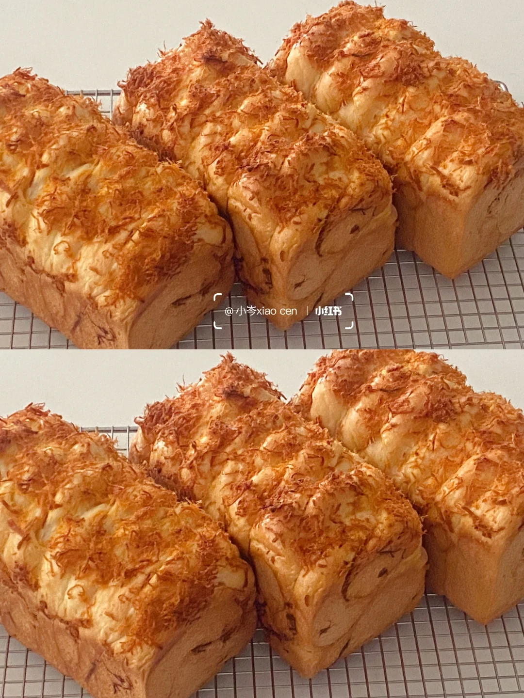 7.翻面,涂抹沙拉酱,撒上肉松,上下折叠,切成8条,上边留2厘米宽,分别卷成麻花状,从上至下卷起来,放入450g吐司模具中。