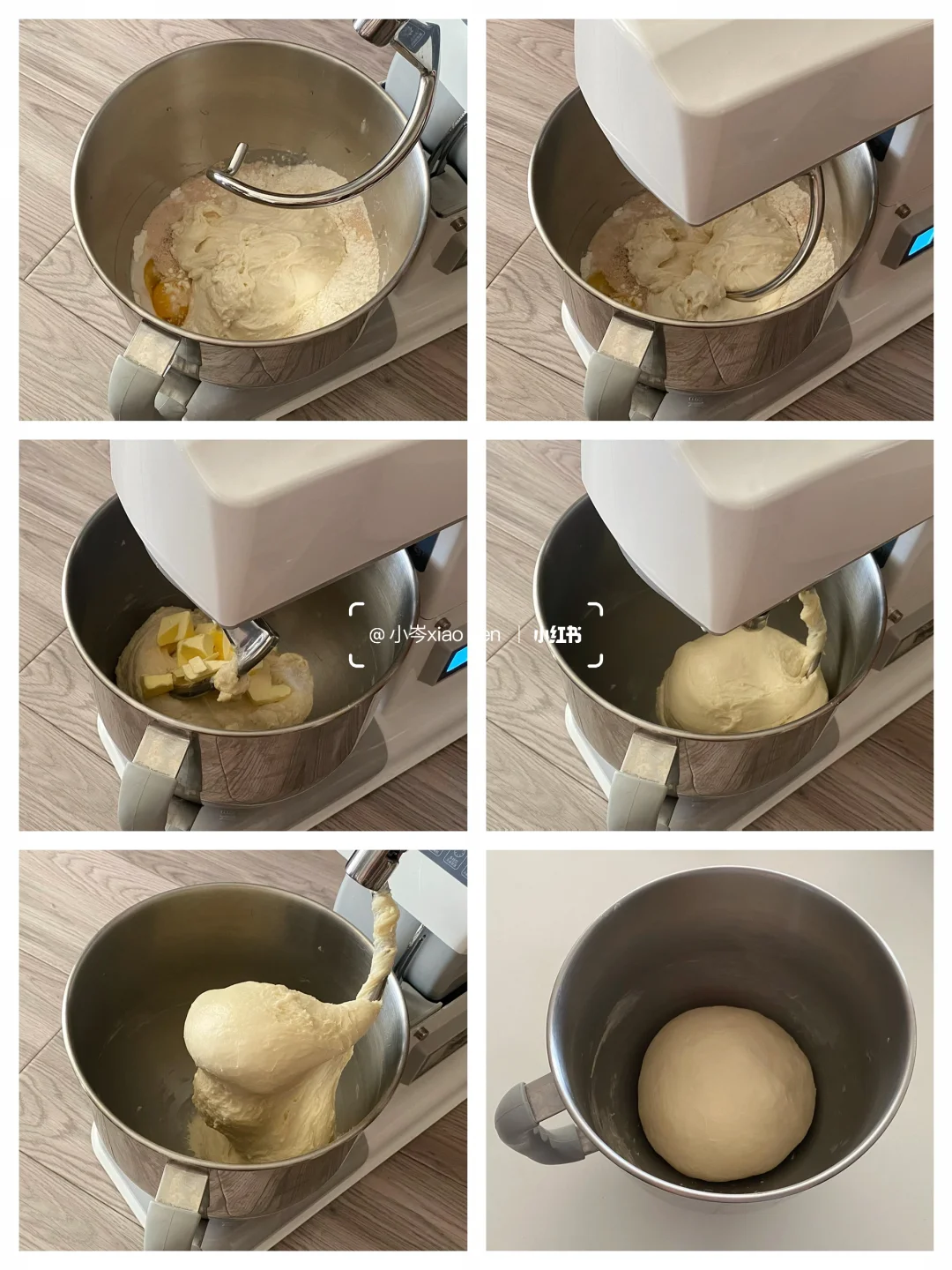 2.除盐、黄油以外的食材倒入厨师机揉面桶内,选择2-5档,先低速再高速混合,打至粗膜状态加盐和黄油,继续打面至完全扩展阶段。
