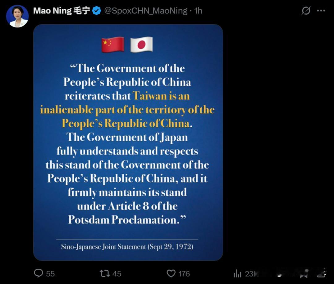 毛宁用英日双语发布4张海报,并提醒日方:无论谁当政,日本都必须信守承诺 据媒体报道北京时间16日,中国外交部发言人毛宁在社交平台X上援引1972年《中日联合声明》中涉台内容,用英语、日语双语发布4张海报提醒日方“无论谁当政,日本都必须信守承诺”。 毛宁先后用英日双语发帖称,“1972年的《中日联合声明》里白纸黑字写着,‘日本国政府承认中华人民共和国政府是中国的唯一合法政府’,以及‘日本国政府充分理解和尊重中国政府关于台湾是中华人民共和国领土不可分割的一部分的立场。’无论谁当政,日本都必须信守承诺。” 帖文中,毛宁还配上了四张包含上述内容的英日双语海报。 本月7日,日本首相高市早苗公然宣称“台湾有事”可能构成日本可行使集体自卫权的“存亡危机事态”,暗示可能武力介入台海问题。在中方多次严正交涉后,仍不知悔改,并在国会答辩时坚称,有关言论符合日本政府看法,无意撤回或取消。引发中日两国及国际社会广泛关注和强烈批评。 针对高市的错误言论,中国外交部发言人接连表态:日本当政者妄图介入台海事务,既是对国际正义的粗暴践踏、对战后国际秩序的公然挑衅,也是对中日关系的严重破坏。如日方胆敢武力介入台海局势,将构成侵略行为,中方必将迎头痛击! 高市的涉台言论打破了历届日本政府在台湾问题上的谨慎表述,在日本国内也引起轩然大波。前首相石破茂在13日播出的一档电台节目中表示,日本历届政府在台湾问题上都避免发表类似“在某种情况下就会这样做”的明确言论。多名日本学者、政界人士和社会团体也表示,高市的表态偏离日本长期奉行的对华政策,不利于维护地区和平稳定。 连日来,中国外交部发言人在X等平台密集发布日语、英语海报,引发国际舆论强烈反响,单帖阅读量突破数百万甚至千万。