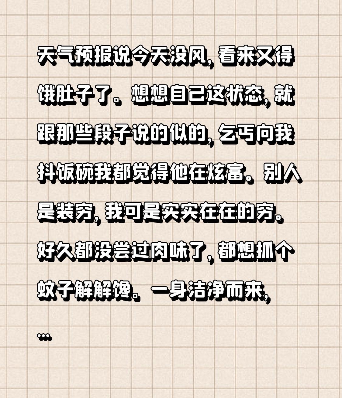 天气预报说今天没风,看来又得饿肚子了。想想自己这状态,就跟那些段子说的似的,乞丐向我抖饭碗我都觉得他在炫富。别人是装穷,我可是实实在在的穷。好久都没尝过肉味了,都想抓个蚊子解解馋。一身洁净而来,两袖清风至今,贫穷就像个甩不掉的跟屁虫,一直追着我。现在只能盼着有点风,好让我能“喝上”西北风。