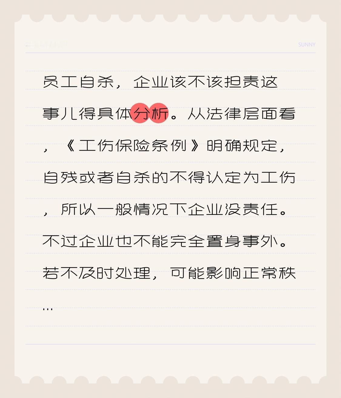 员工自杀,企业该不该担责这事儿得具体分析。从法律层面看,《工伤保险条例》明确规定,自残或者自杀的不得认定为工伤,所以一般情况下企业没责任。 不过企业也不能完全置身事外。若不及时处理,可能影响正常秩序,造成不良社会影响。发现员工自杀后,企业应立即报警,配合调查,给家属人道关怀。比如,企业可加强员工心理健康管理,预防类似事件发生。这不仅是对员工负责,也能减少潜在的麻烦。所以,企业虽通常无直接责任,但有义务做好