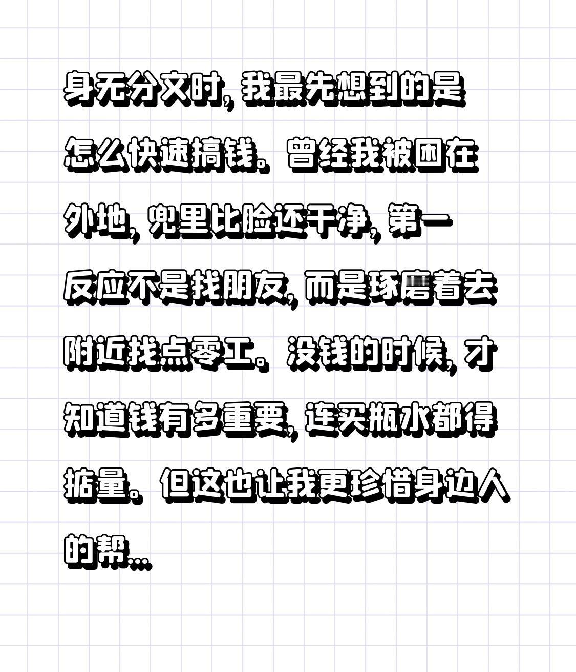 身无分文时,我最先想到的是怎么快速搞钱。曾经我被困在外地,兜里比脸还干净,第一反应不是找朋友,而是琢磨着去附近找点零工。 没钱的时候,才知道钱有多重要,连买瓶水都得掂量。但这也让我更珍惜身边人的帮助,有次实在撑不住跟朋友开了口,朋友二话不说就转了钱。 这种经历还锻炼了我的应变能力,为了生活我去发过传单、做过小时工。它也让我看到社会上还有很多人在为生活奔波,以后有能力了,也想帮帮他们。