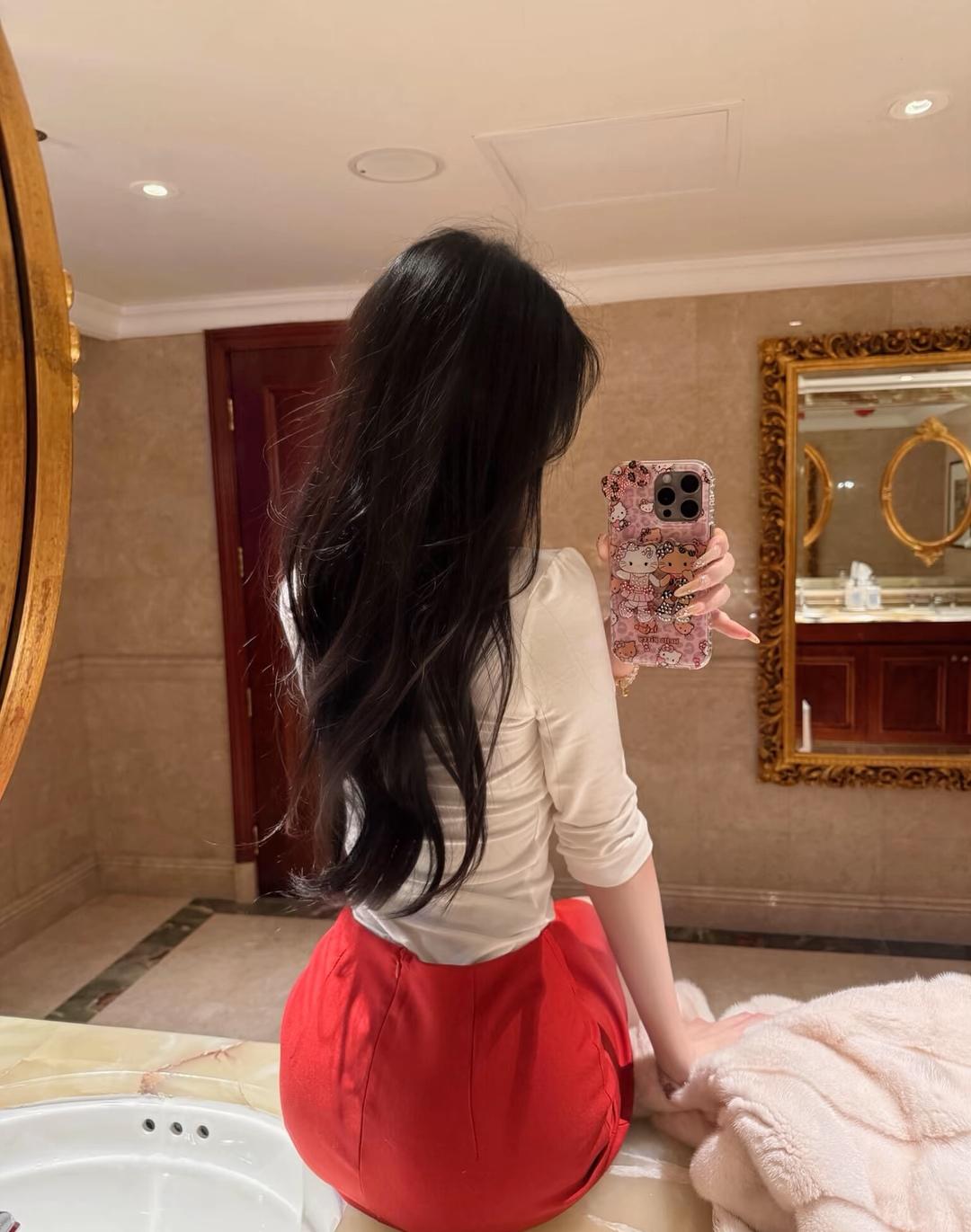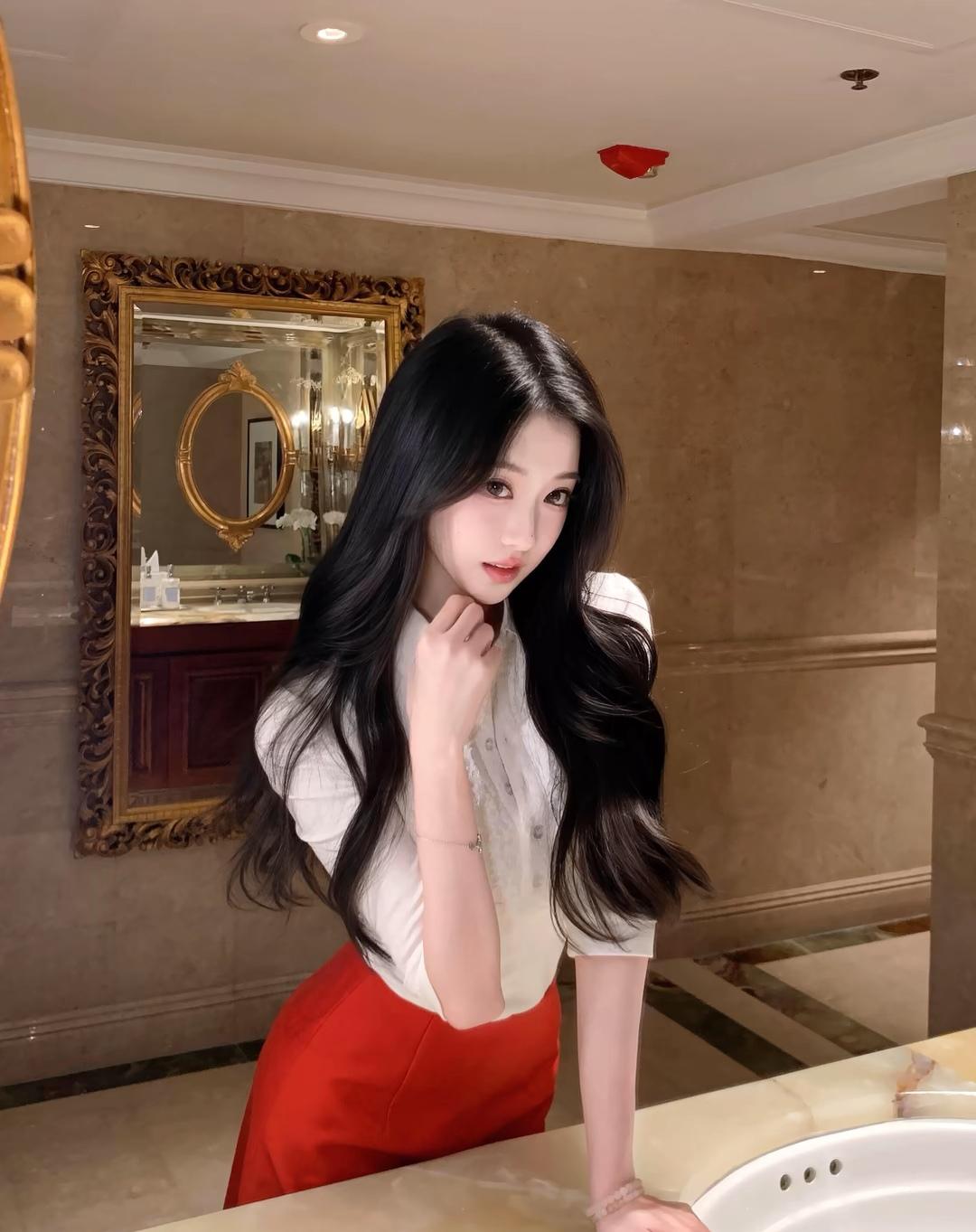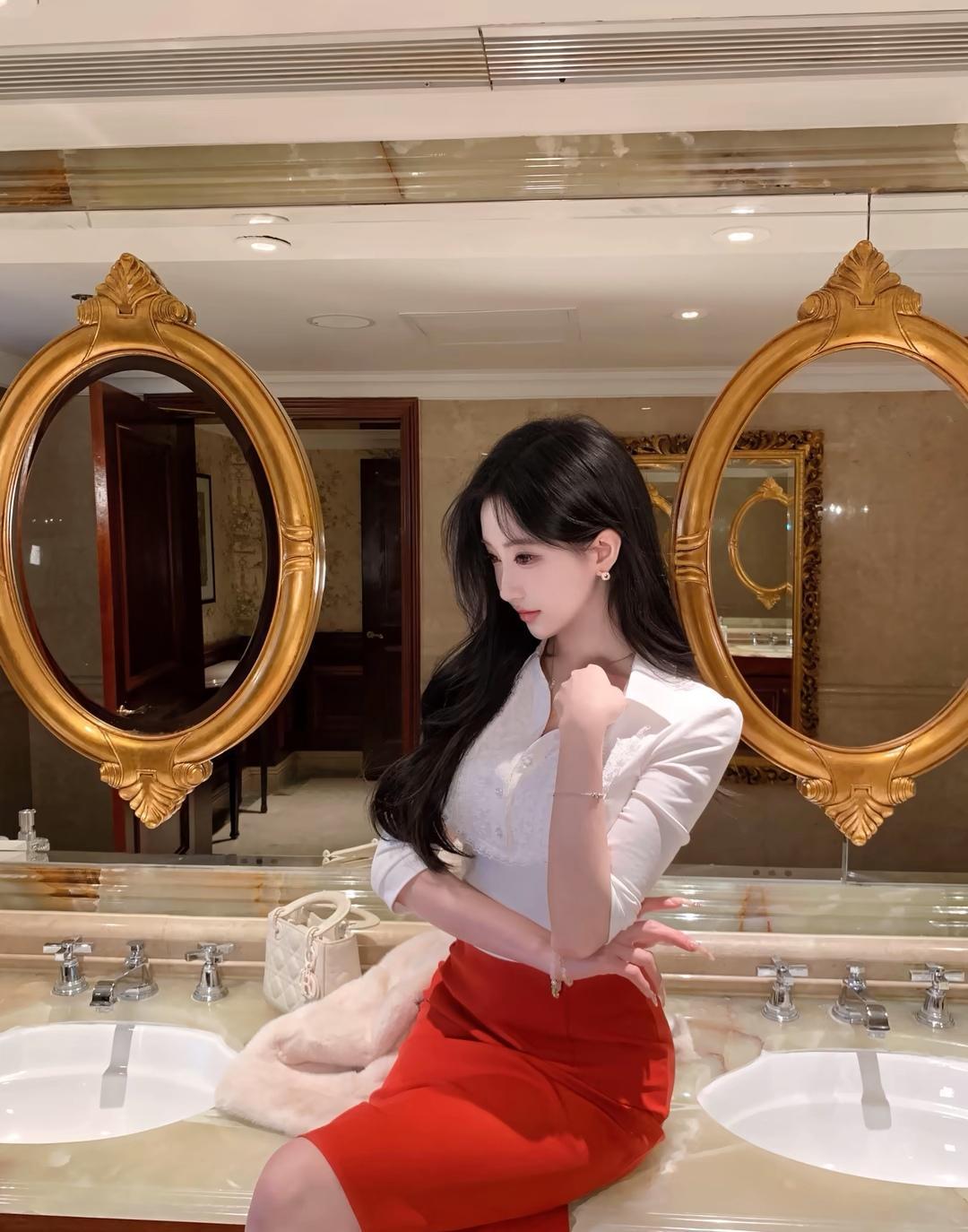 优雅自拍,红裙白衣,镜中倒影,美不胜收