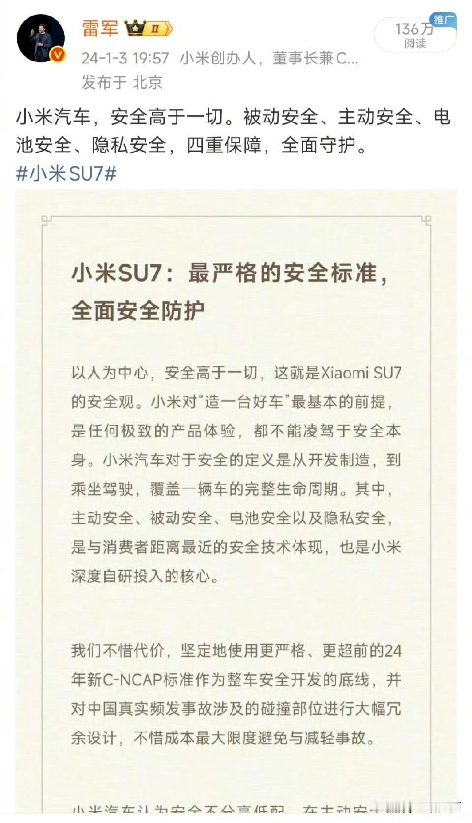 雷军今天连发多条微博吐槽“网上有不少人断章取义、歪曲抹黑”,还翻出两年前的旧动态自证清白,这是真被气到了啊! 事情的导火索很简单:有人把雷军之前的采访片段剪出来,说他觉得“小米汽车好看比安全重要”,这话一放出来,立马引发轩然大波。毕竟汽车安全可是底线,这话要是真的,难怪大家会质疑。 但雷军直接晒出实锤反击:早在2023年底小米SU7发布前,他就反复强调“安全高于一切”,车身用了90%以上的高强钢和铝,最高强度达2000MPa,整车扭转刚度更是飙到51000Nm/deg,电池安全、主动安全这些也都做了四重保障。他解释说,当初采访里说“好看是第一位”,是建立在“安全是基础、是前提”之上的,一辆车要是不安全,再好看也没用,这俩根本不矛盾,被人恶意剪片段误导大众也太冤了! 其实熟悉雷军的人都知道,他不是第一次被断章取义了。早年间说“干翻华为”,实际是想在相机技术上超越华为,结果被传成中国企业恶性竞争;这次聊产品设计,又被揪着一句话放大,只能说顶流品牌太难了。 不过话说回来,小米汽车自上市后就争议不断,之前的事故舆情、官媒批评,再加上现在的断章取义风波,确实让雷军和小米压力山大。作为从手机跨界造车的巨头,大家对小米的期待本就很高,而汽车行业又直接关乎生命安全,一点风吹草动都容易被放大。 但客观说,断章取义搞歪曲抹黑真的不可取。不管是支持还是质疑,都得基于完整语境和事实吧?雷军这次晒出两年前的安全理念声明,就是想证明小米对安全的重视不是说说而已。汽车行业竞争激烈,靠抹黑对手、误导消费者赢不来市场,不如把精力放在技术研发和产品优化上。 现在网友们也吵翻了,有人觉得雷军确实冤,支持他硬刚抹黑者;也有人说作为车企,面对质疑应该更耐心回应,而不是直接吐槽“被抹黑”。
