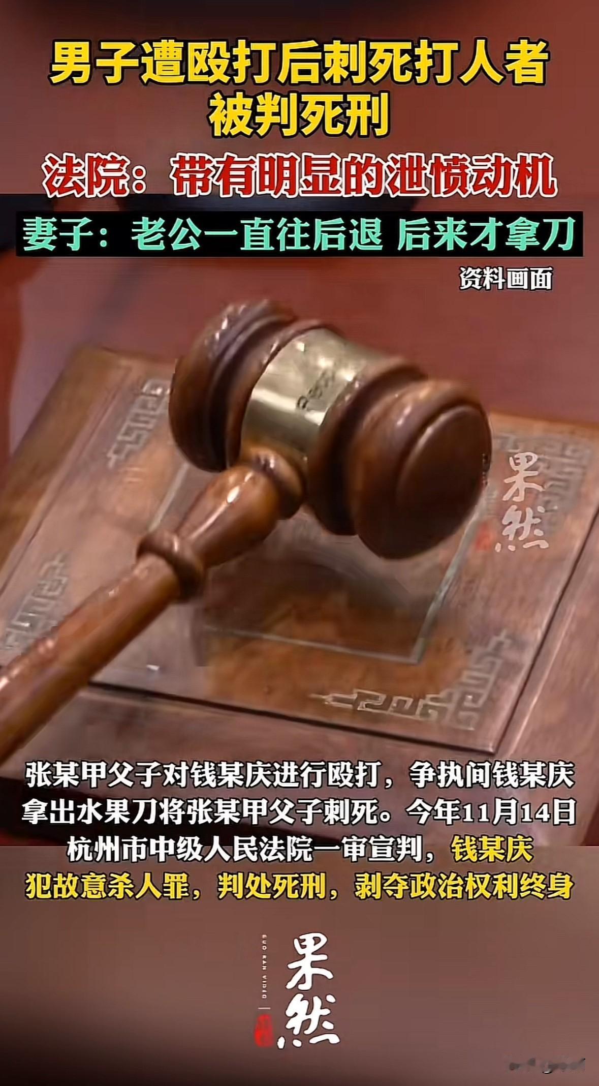 杭州这起案子真让人唏嘘。因菜地纠纷,张某乙酒后打砸钱某庆家楼下超市,还和父亲在门口堵着钱某庆殴打。钱某庆提前带刀防身,被打后捅刺父子俩致其死亡,一审被判死刑。 法院说张某乙没带凶器,侵害没到危及生命的程度,钱某庆捅刺过激,有泄愤报复意图,不算正当防卫。钱某庆妻子觉得是正当防卫,已决定上诉。 这事也提醒大家,邻里纠纷别冲动,遇到不法侵害先想办法脱身报警。正当防卫有明确边界,防卫强度得和侵害匹配,不然维权变违法,得不偿失。后续上诉结果值得关注,也希望大家遇事冷静,别让小事酿成悲剧。