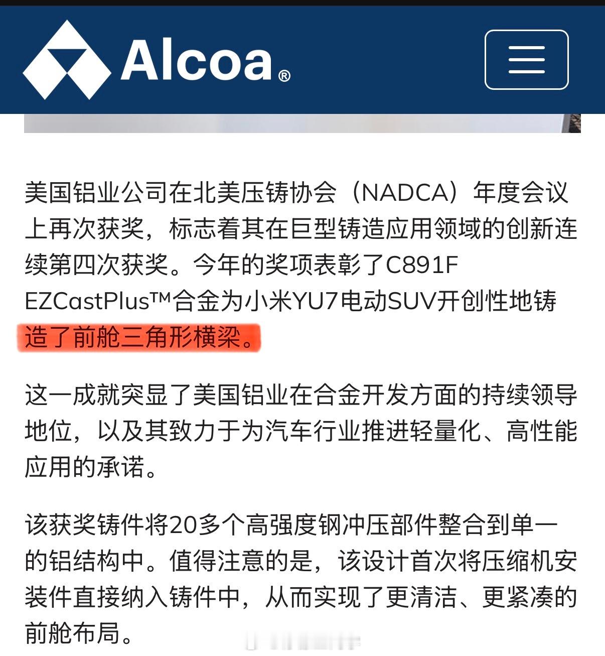 没想到前几天发小米获得权威机构颁发的“最佳结构奖”也有键盘侠站出来杠,说是发给材料供应商的……不是哥们“STRUCTURAL”就是结构的意思,而不是“Material”(材料),而且获奖单位也明确的写着“Xiaomi Auto Technology Co, Ltd”,提名人员前三位也是小米的员工,这已经很明确获奖的就是小米,而非什么其他供应商这次获奖的主要部件是「前舱三角梁总成」,小米把之前要多道工序的零部件,用大压铸一次压铸成型,进一步提高了安全性,这才是奖项的关键所在,而不是被制造成总成的原材料其实换个角度想想,有这么多双眼睛盯着小米汽车也算是个好事,百万网友严选,这都挑不出毛病,说明更能选择他了,某些人的键盘敲得越响,只会让小米的技术越硬核