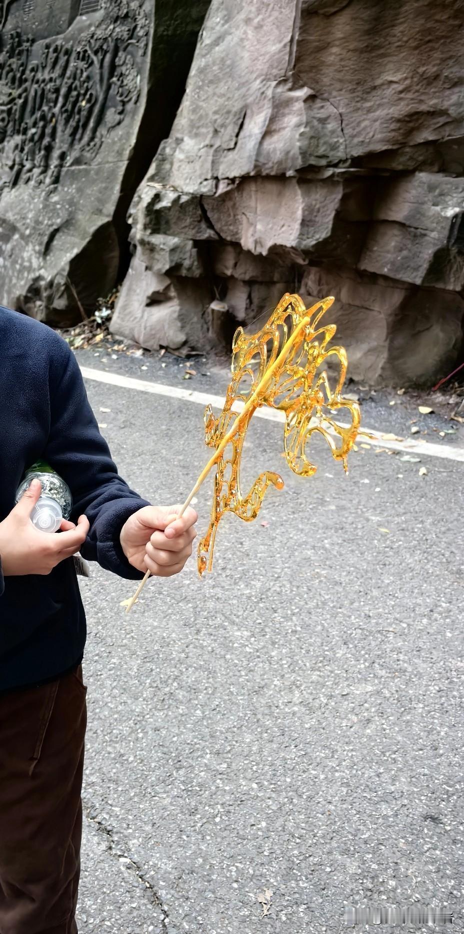 糖画, 十块钱一份, 一对中年夫妇摆的摊子, 摊子周边围了一圈小朋友, 扫码排队拿号, 一个一个的来, 排了十多分钟终于轮到了, 选了一个虎, 拿着边走边吃, 步行了约五十米, 糖画只吃了一小半, 剩下的部分脱离棒棒掉地下了, 是那个棒棒没有粘紧, 看来做工还有待改进。 有点儿遗憾, 但也就那样了。