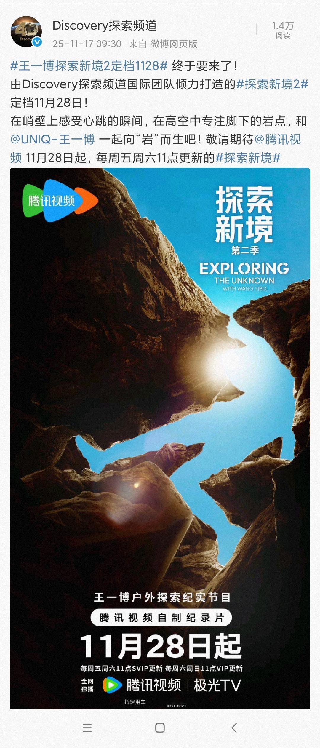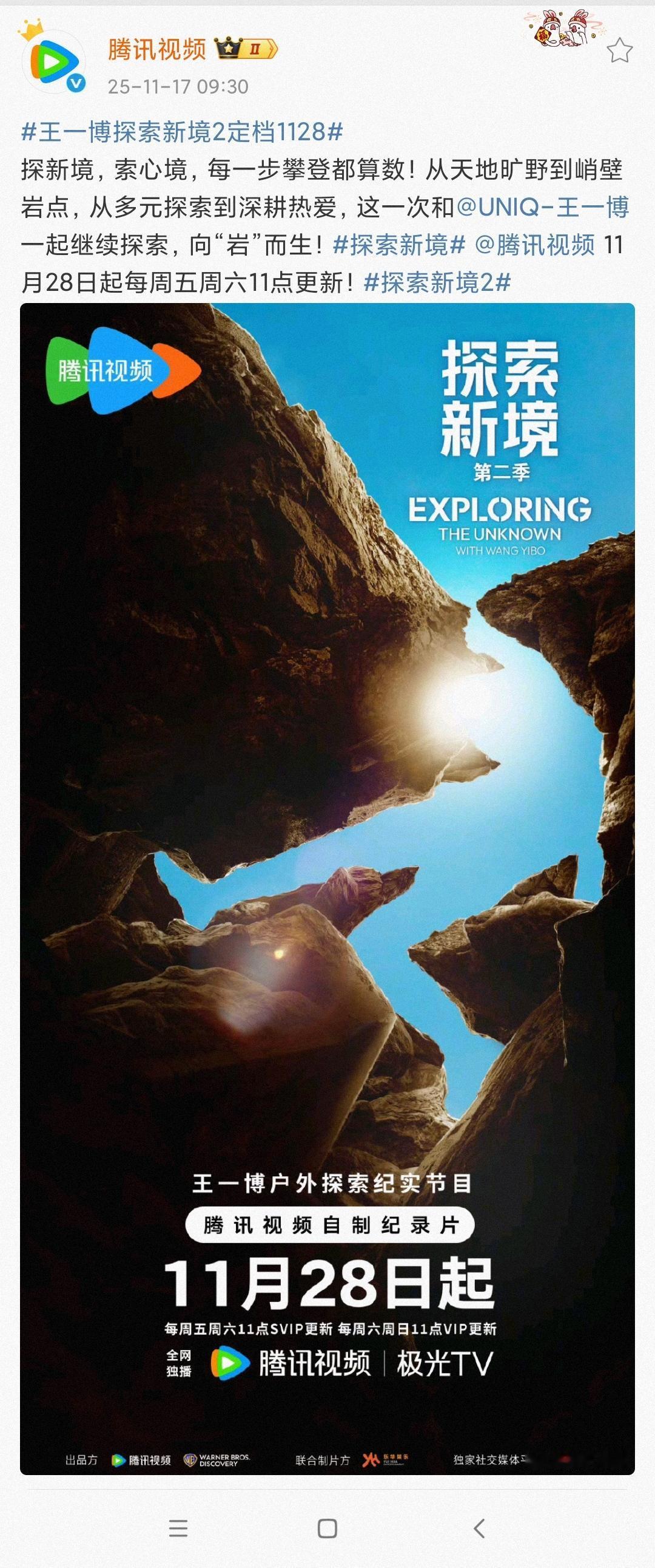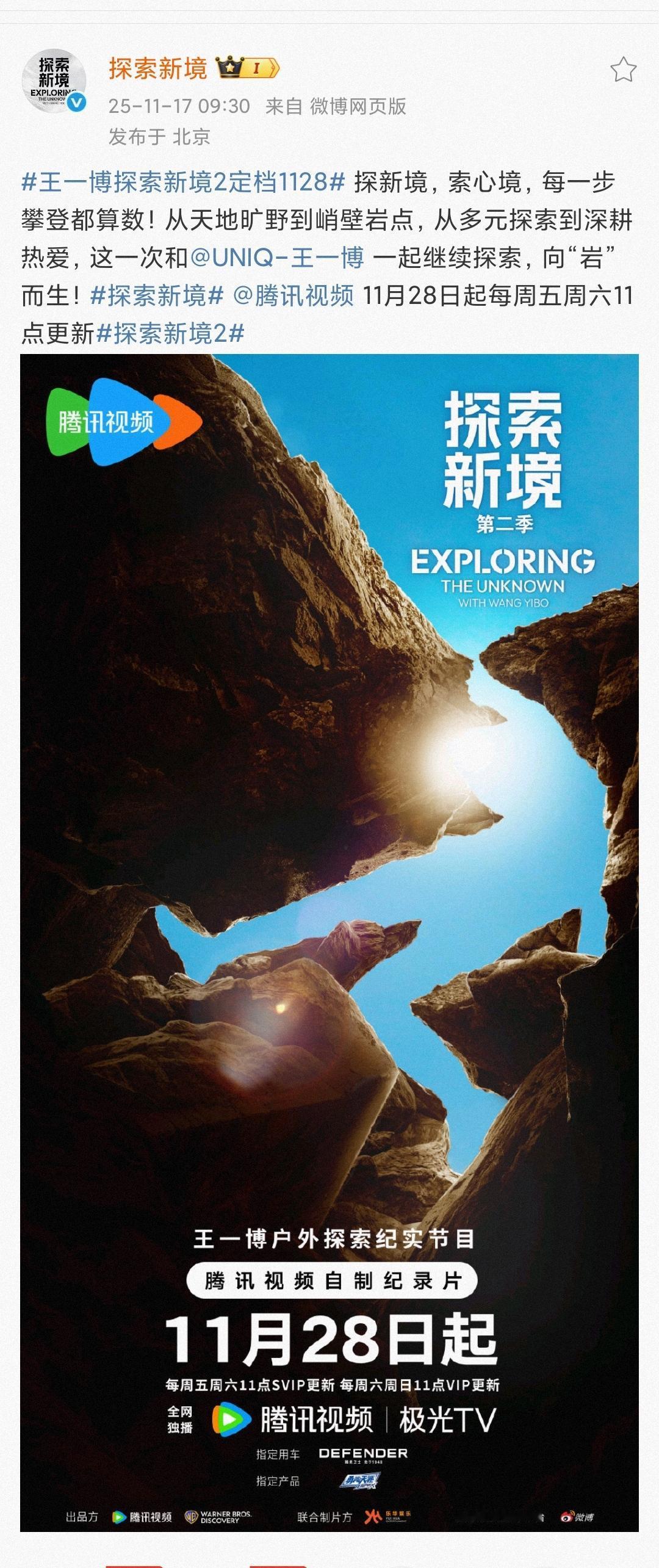 探新境,索心境,每一步攀登都算数! 王一博个人ip纪录片《探索新境2》官宣定档1128!!! 最好看的户外探索纪录片,最强大的王一博个人ip,最不一样的“牛掰”人生,王一博带你一起“向岩而生”! 王一博探索新境2定档1128