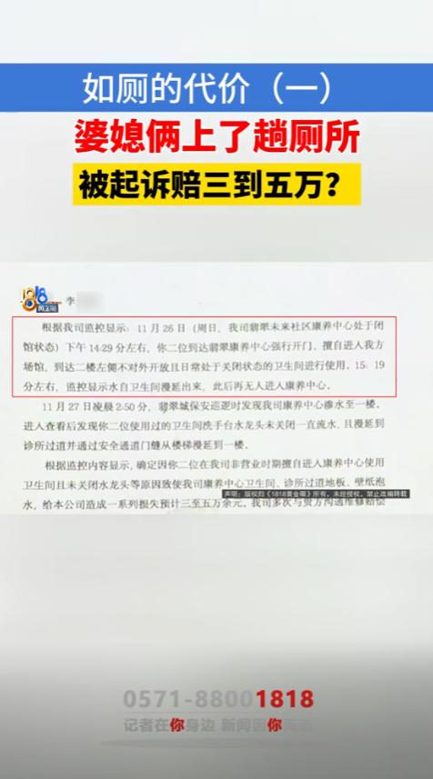 “这个厕所上的代价太大了!”浙江,女子和婆婆散步后,有些尿急,婆婆领她去一家康养中心二楼上厕所。第二天,却接到民警电话。紧跟着,康养中心张贴告知函,说她们强行进入不对外开放的卫生间,造成漏水,损毁地板,损失高达3到5万,要求赔偿,否则就起诉。女子丈夫看了监控视频后,却提出4点疑问。 据1818黄金眼11月15日报道,事情发生在2023年11月26日下午两点多,李女士陪着婆婆在外面溜达,两人突然都想上厕所。 婆婆是附近小区的业主,对周边环境很熟,便提议去社区配套的康养中心解决一下,到了门口,发现门虚掩着,里面虽然没开大灯,但看起来也不像是完全封闭的样子,墙上还贴着下午一点到五点开放的告示。 两人没多想,就推门进去,径直上了二楼的卫生间,在她们看来,这不过是一次再正常不过的“借用”,可谁知道,这趟厕所上完,麻烦就悄悄跟来了。 几天后,李女士突然接到了民警的电话,核实她们当天是不是去过康养中心,虽然警察排除了她们非法闯入的嫌疑,但这件事让李女士心里犯起了嘀咕。 果然,没过多久,更大的风暴来了,康养中心直接在家门口和小区大门,张贴了一份印着她和婆婆全名的《告业主函》。 函上白纸黑字写着,婆媳二人在康养中心闭馆期间,强行闯入,使用了不对外开放的卫生间,并且离开时没有关水龙头,导致水漫金山,泡坏了地板和墙纸,损失高达三到五万元,要求她们立刻协商赔偿,不然就法庭上见。 这一下,李女士和婆婆彻底懵了,门明明是虚掩的,怎么就成了“强行闯入”?水龙头明明拧得紧紧的,怎么就成了“没关”?这不就是明摆着栽赃陷害吗? 街坊邻居们看着大字报议论纷纷,让婆婆觉得脸都丢尽了,李女士的丈夫知道后更是火冒三丈,这口气无论如何也咽不下去,他决定亲自去康养中心讨个说法,把事情查个水落石出。 丈夫一到现场,就觉得不对劲,他首先试了试那扇门,发现如果真的锁上了,凭两个女人的力气根本推不开。 而且,墙上贴的开放时间写得明明白白,她们去的时候正是在营业时间内,何来“闭馆”一说?为了弄清真相,他要求查看监控录像。 这一看,疑点更多了,监控录像清晰地记录了婆媳俩进出卫生间的全过程,录像里能听到,两人先后用完厕所、冲水,等她们离开后,卫生间里就再也没有持续的水流声了,这说明,她们走的时候水龙头肯定是关好的。 更蹊跷的是康养中心提供的那段所谓的“漏水证据”视频,视频是保安在第二天凌晨两点多拍的,画面里保安嘴里念叨着“水龙头没关”,可当丈夫把视频定格放大后,一个让他哭笑不得的细节出现了——那个被指控“元凶”的洗手池,边缘竟然是干的!一点水渍都没有。 他心里琢磨,要是水龙头真开了十几个小时,水早就漫出水池了,池子边上怎么可能干干净净?这视频八成是后来补拍的,想制造一个假现场。 紧接着,丈夫又在监控里发现,积水最早出现的地方,并不是婆媳俩用过的那个卫生间,而是走廊另一头的一个中医理疗室。 那个理疗室里同样有洗手池,水龙头也能出水,这就很奇怪了,漏水点明明在别处,为什么偏偏要把锅甩给上厕所的婆媳? 为了彻底搞清楚,李女士的丈夫提出了一个最直接的要求:提供事发当天的水表数据,如果真像康养中心说的那样,水龙头开了十几个小时,水表的读数肯定会异常飙升。 然而,面对这个合情合理的要求,康养中心却开始支支吾吾,找各种理由推脱,就是不肯提供,这下,丈夫更加坚信,这里面一定有猫腻,妻子和母亲就是被找来背黑锅的“冤大头”。 这件事在网上曝光后,网友们也炸了锅,很多人都觉得康养中心的做法太离谱了。 “这不就是典型的碰瓷吗?证据漏洞百出还敢要五万,保安的视频连自己都说服不了吧?” “最气人的是把人家全名贴出来,这是索赔还是人身攻击?还没定论呢就搞得人尽皆知,太缺德了!” 大家的评论,几乎一边倒地指向了康养中心的蛮不讲理,说到底,这件事之所以让人愤怒,不仅仅是因为那三五万的索赔,更是因为康养中心处理问题的方式充满了傲慢和不尊重。 在没有任何确凿证据的情况下,他们首先选择了最极端的方式——报警、贴大字报、公开个人信息,试图用舆论压力逼迫对方就范。 这种做法,已经不是简单的民事纠纷,而是对个人名誉和隐私的公然侵犯,他们似乎忘了,要别人承担责任,首先得拿出让人信服的证据链。 一家提供服务的康养中心,本应以诚信和关怀为本,如今却为了推卸自身场地维护不当可能造成的损失,不惜冤枉两位只是临时借用厕所的普通人。 这种行为,不仅暴露了管理的混乱,更丧失了最基本的道义和担当,想让别人赔钱,可以,但请拿出证据来,而不是靠猜测和栽赃,这件事拖了两年还没解决,恐怕不是因为事情复杂,而是因为有人从一开始就没打算讲道理。 信源:1818黄金眼2025-11-15——李女士反映,两年前和婆婆一起在社区康养中心上了一趟厕所,之后被起诉,要求赔偿三到五万元
