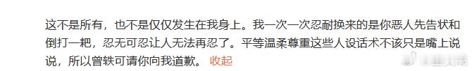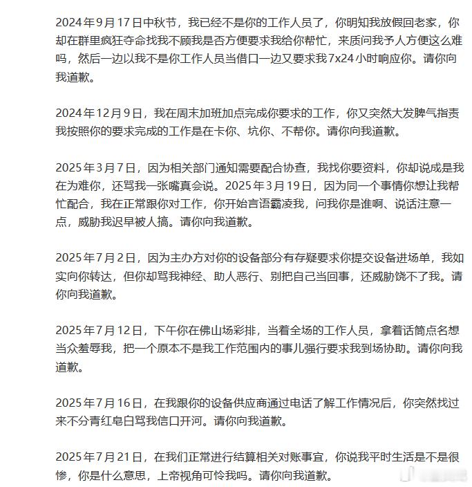前工作人员发文控诉曾轶可,在我跟你共事和合作期间,你多次情绪失控,在公开场合言语羞辱、人身攻击、威胁等系列职场霸凌行为,对我的职业尊严与心理健康造成了严重且持续的伤害。曾轶可,请你向我道歉。