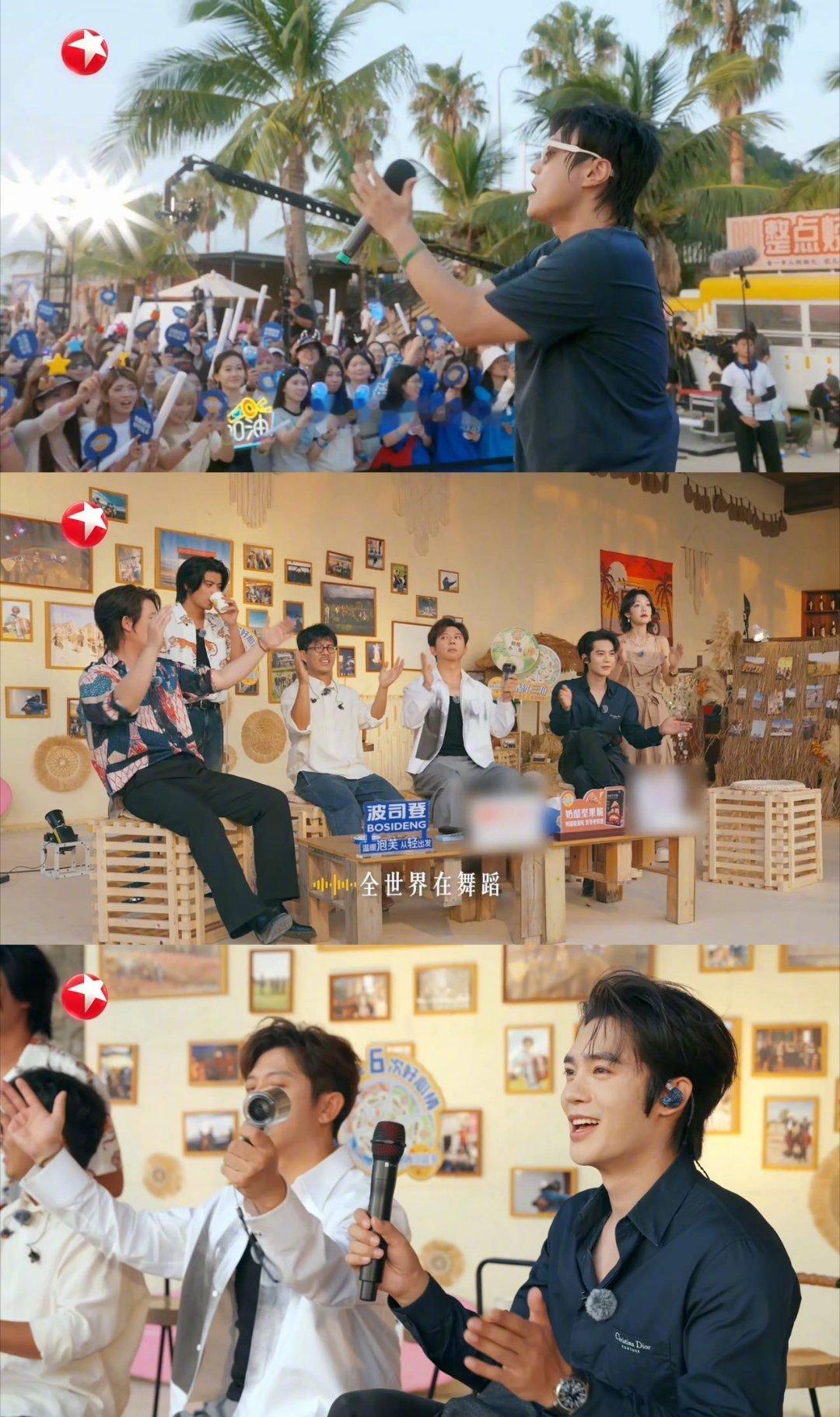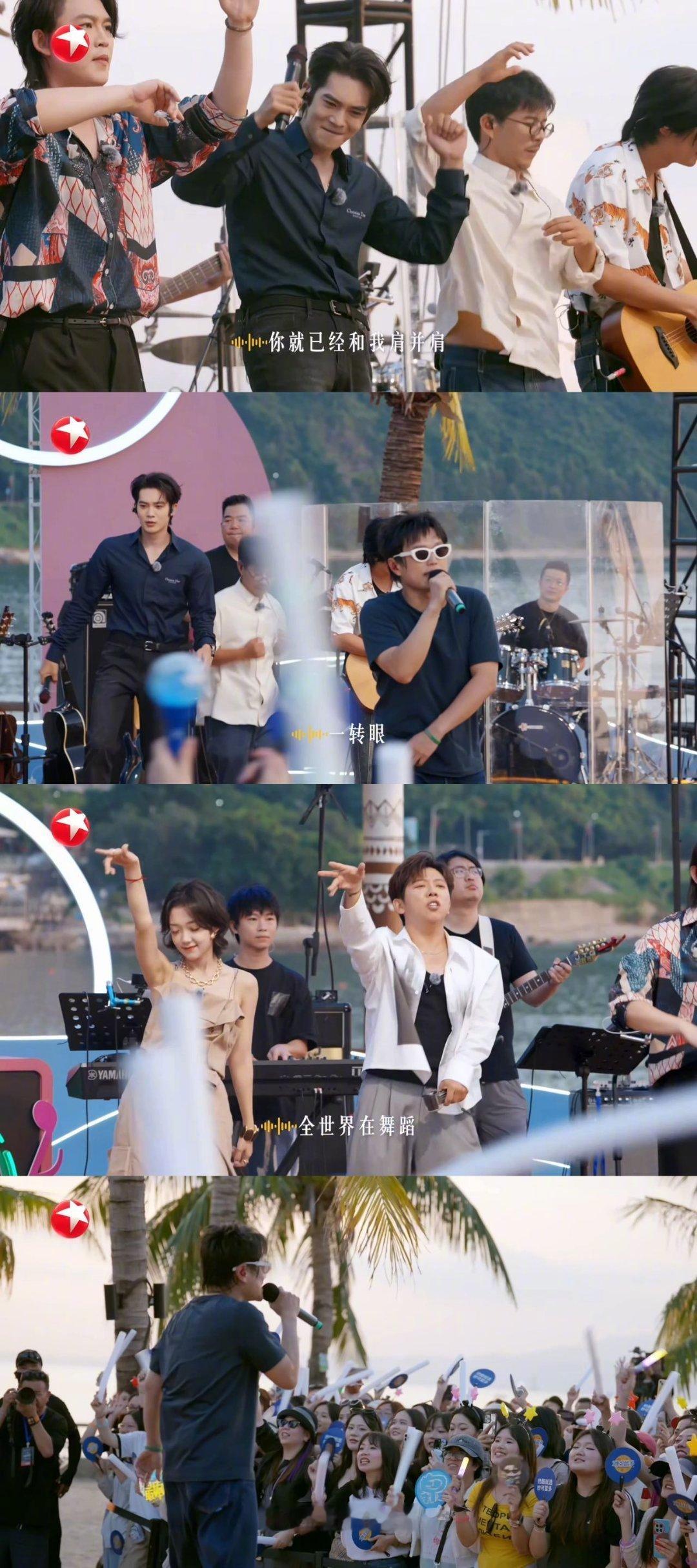 火星电台这个舞台把嘉宾们一个个都嗨到台上了,艺人还自备了唱跳环节,椰林海边就这么自在得沉浸在音乐中