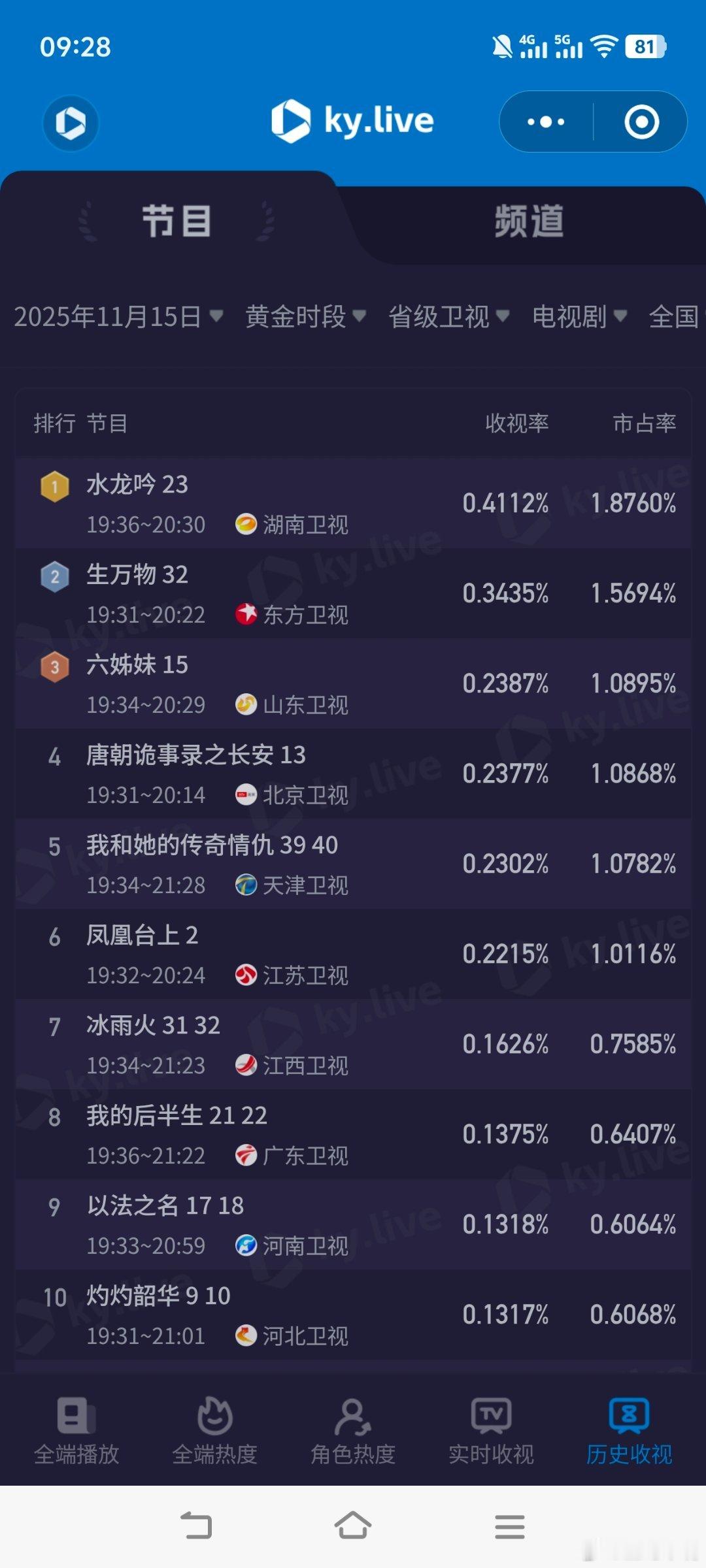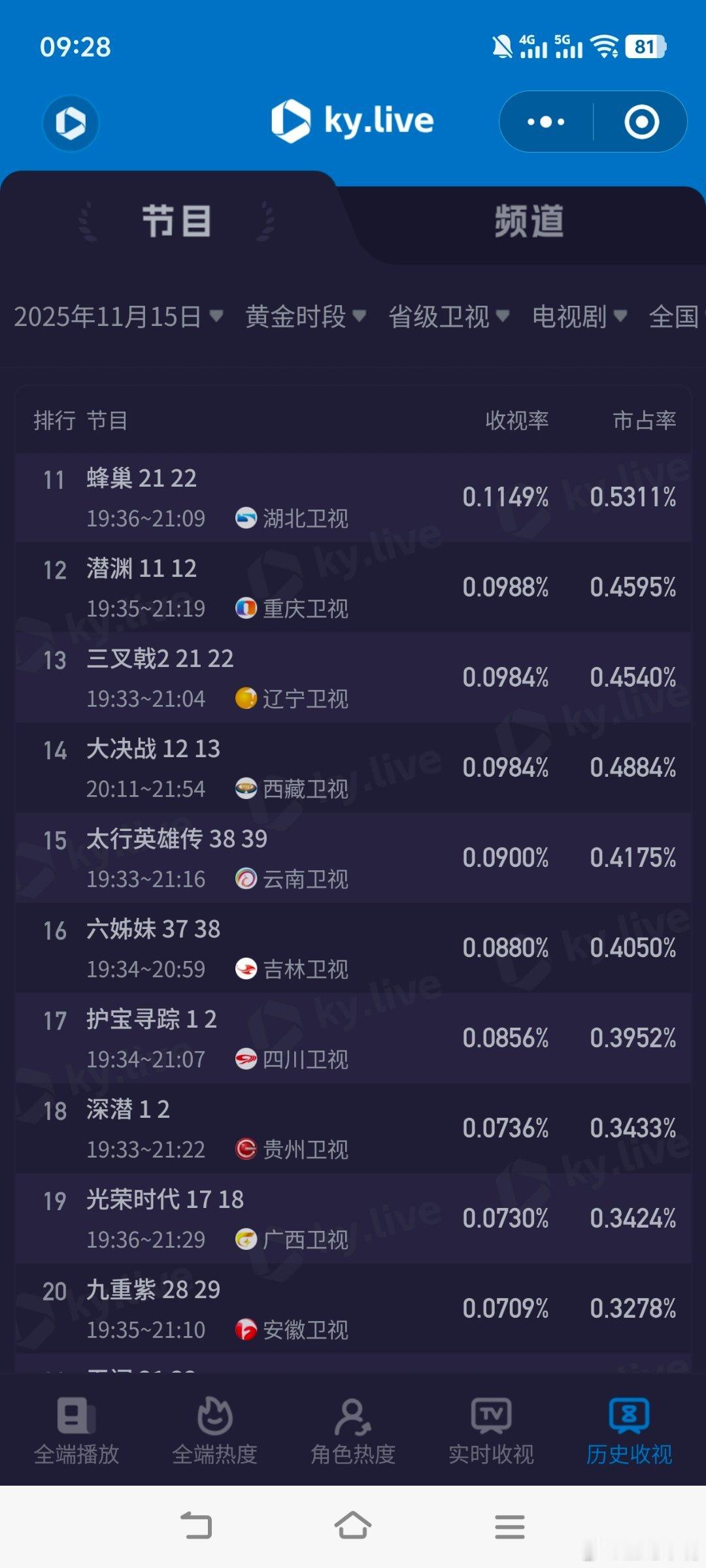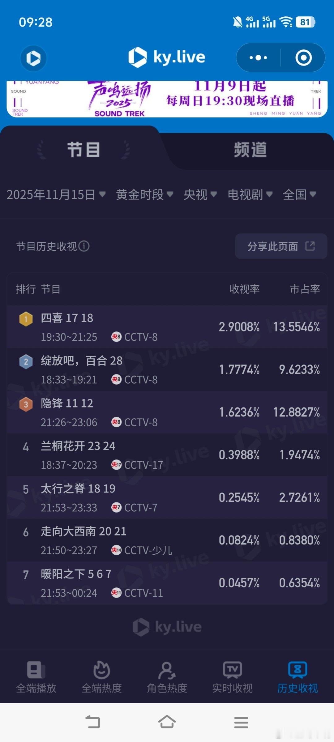 11月15日cvb收视日报四喜 2.356,酷云2.9008,系数0.812隐锋 1.681,酷云生万物0.397,酷云0.3435,系数1.156水龙吟0.280,酷云0.4112,系数0.681唐诡3 0.235,酷云0.2377,系数0.989凤凰台上0.165,酷云0.2215,系数0.745