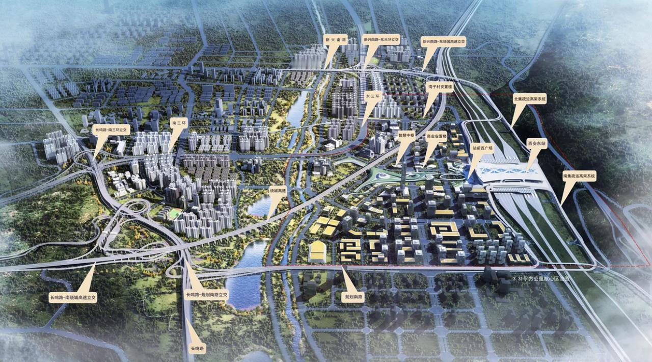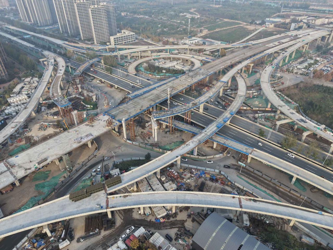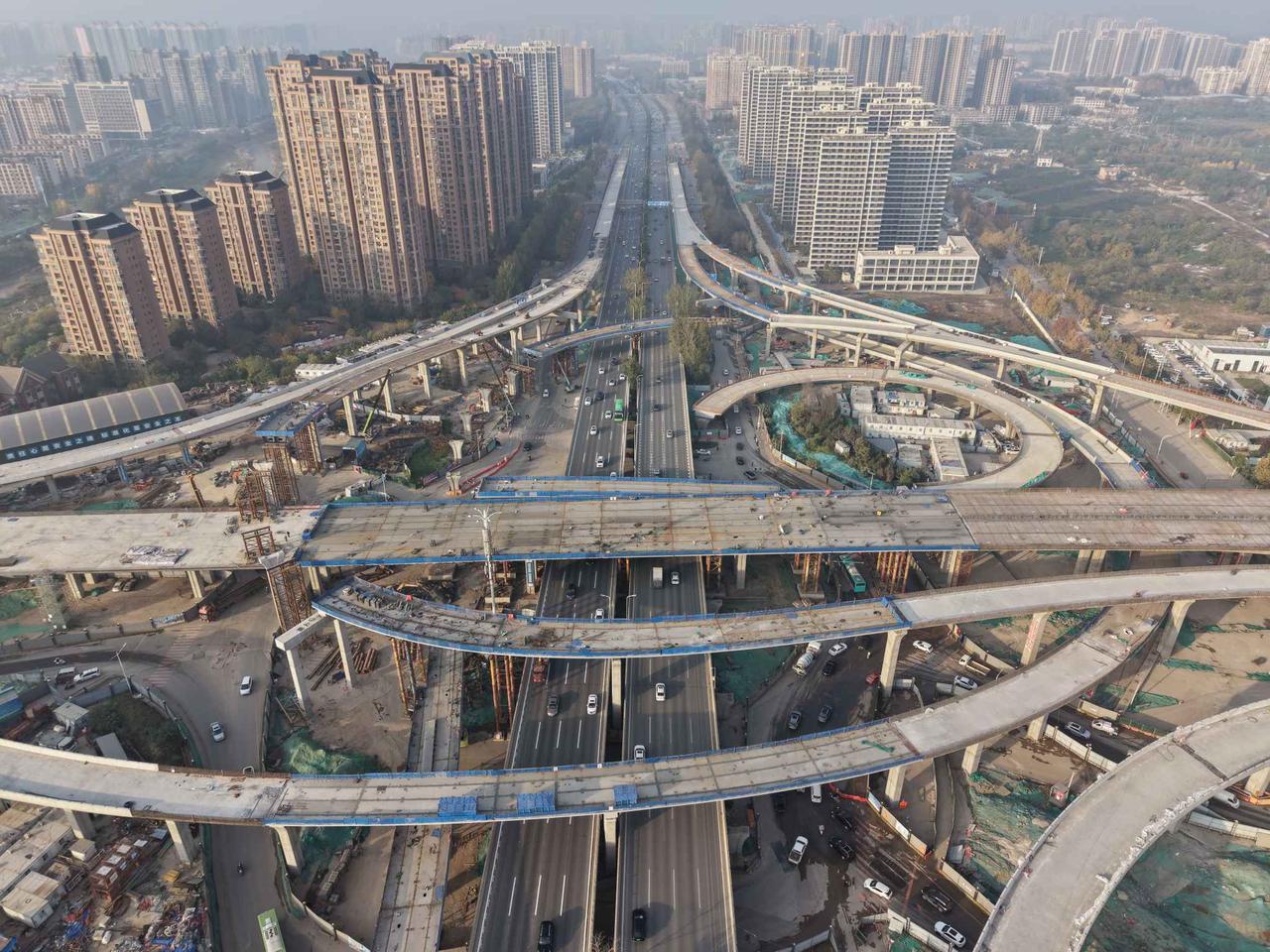 围绕西安东站构建的高架快速路正在成型,涉及新兴南路、长鸣路同三环路和绕城高速之间的多处互通立交,以及衔接高铁站南北两侧的高架疏运系统,总长度超过47公里。(航拍©ChrisZhang)