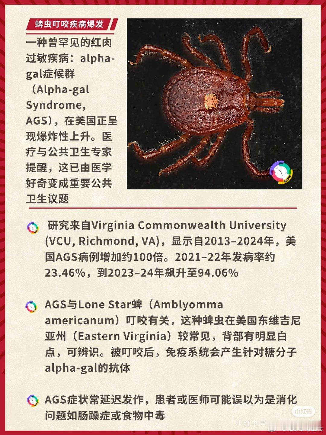 蜱虫长得就很吓人,而且可以会传染各种疾病。一种曾罕见的红肉过敏疾病——alpha-gal症候群( Alpha-gal Syndrome, AGS),在美国正呈现「爆炸性上升」。医疗与公共卫生专家提醒这已由医学好奇变成重要公共卫生议题。