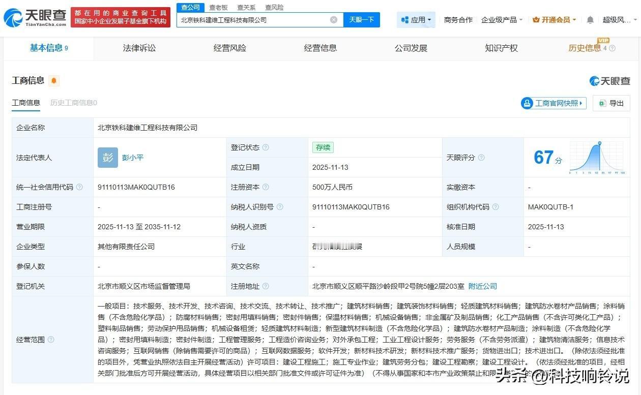【东方雨虹等在北京成立工程科技公司 注册资本500万】 天眼查App显示,近日,北京铁科建维工程科技有限公司成立,法定代表人为彭小平,注册资本500万人民币,经营范围包括建筑材料销售、建筑装饰材料销售、轻质建筑材料销售、密封用填料销售等。股东信息显示,该公司由东方雨虹(002271)、彭小平共同持股。 天眼查信息: