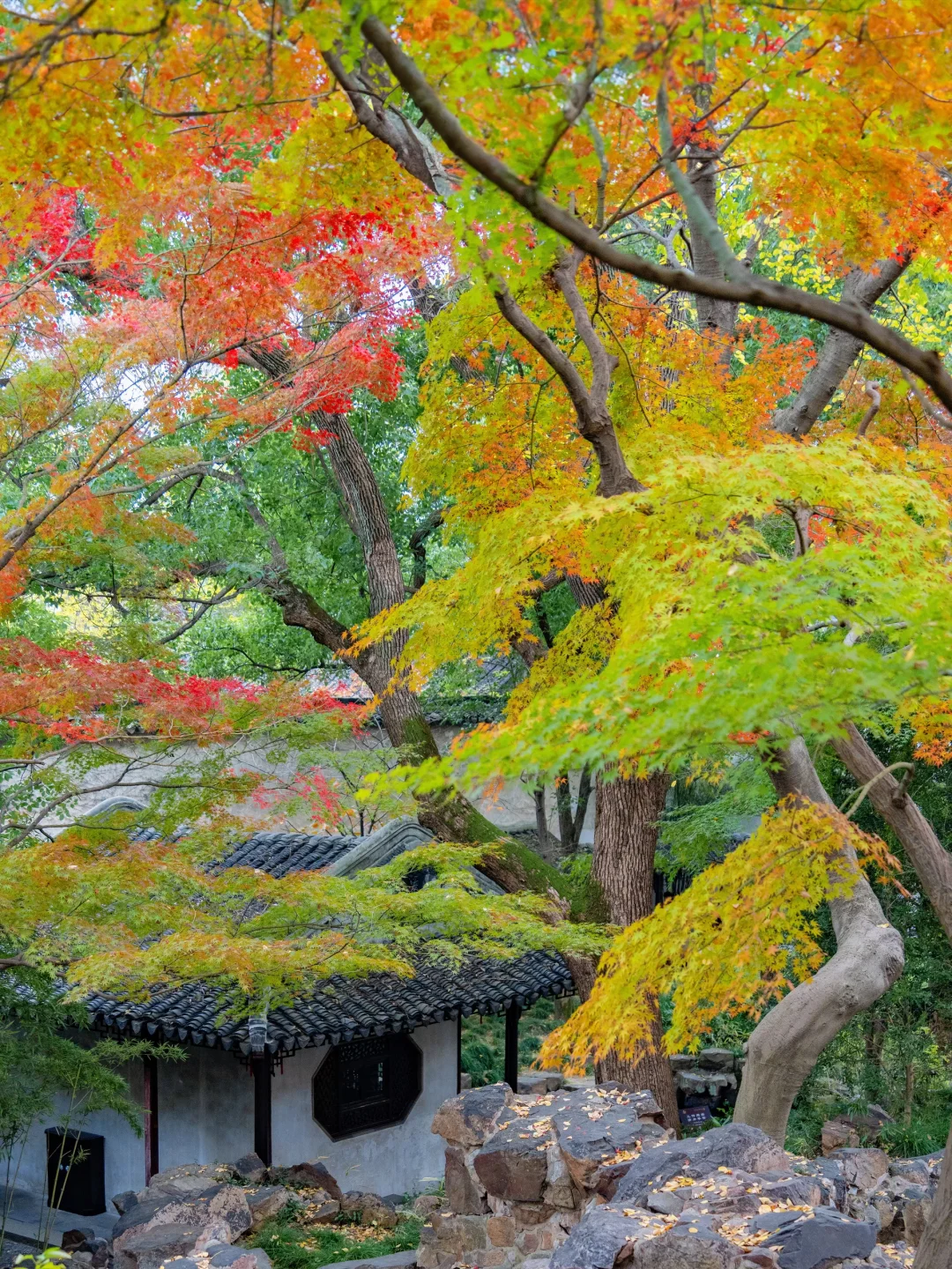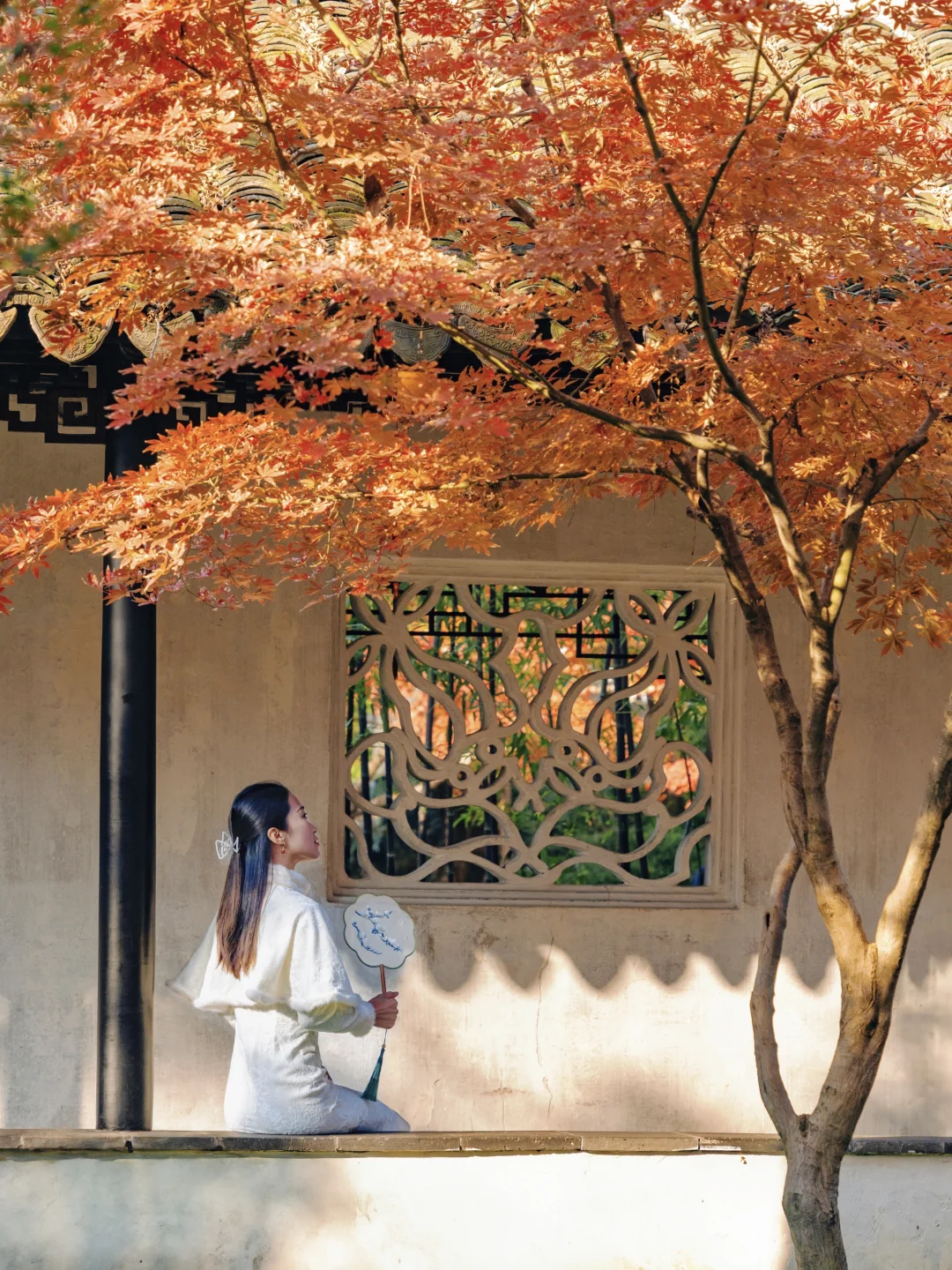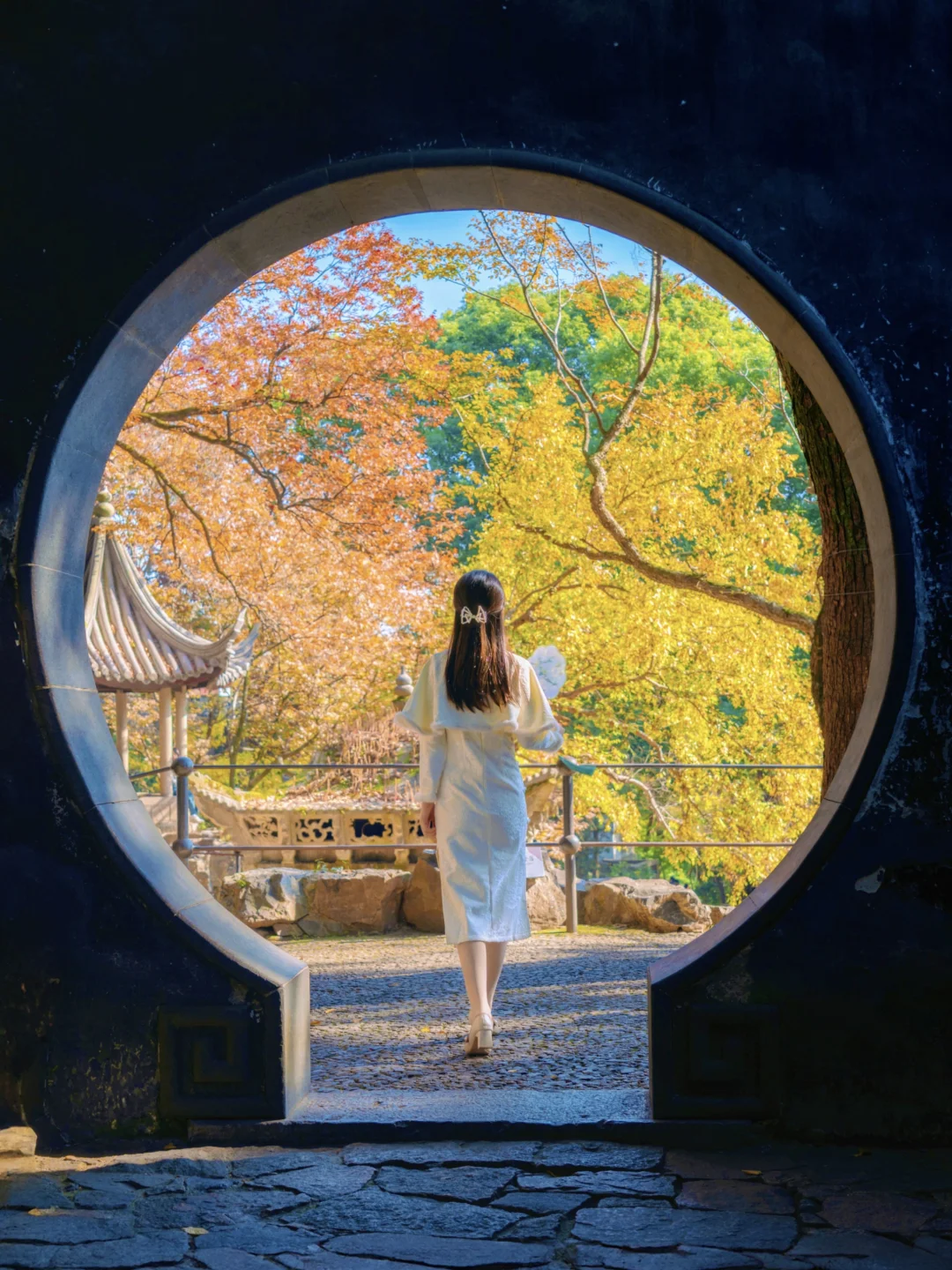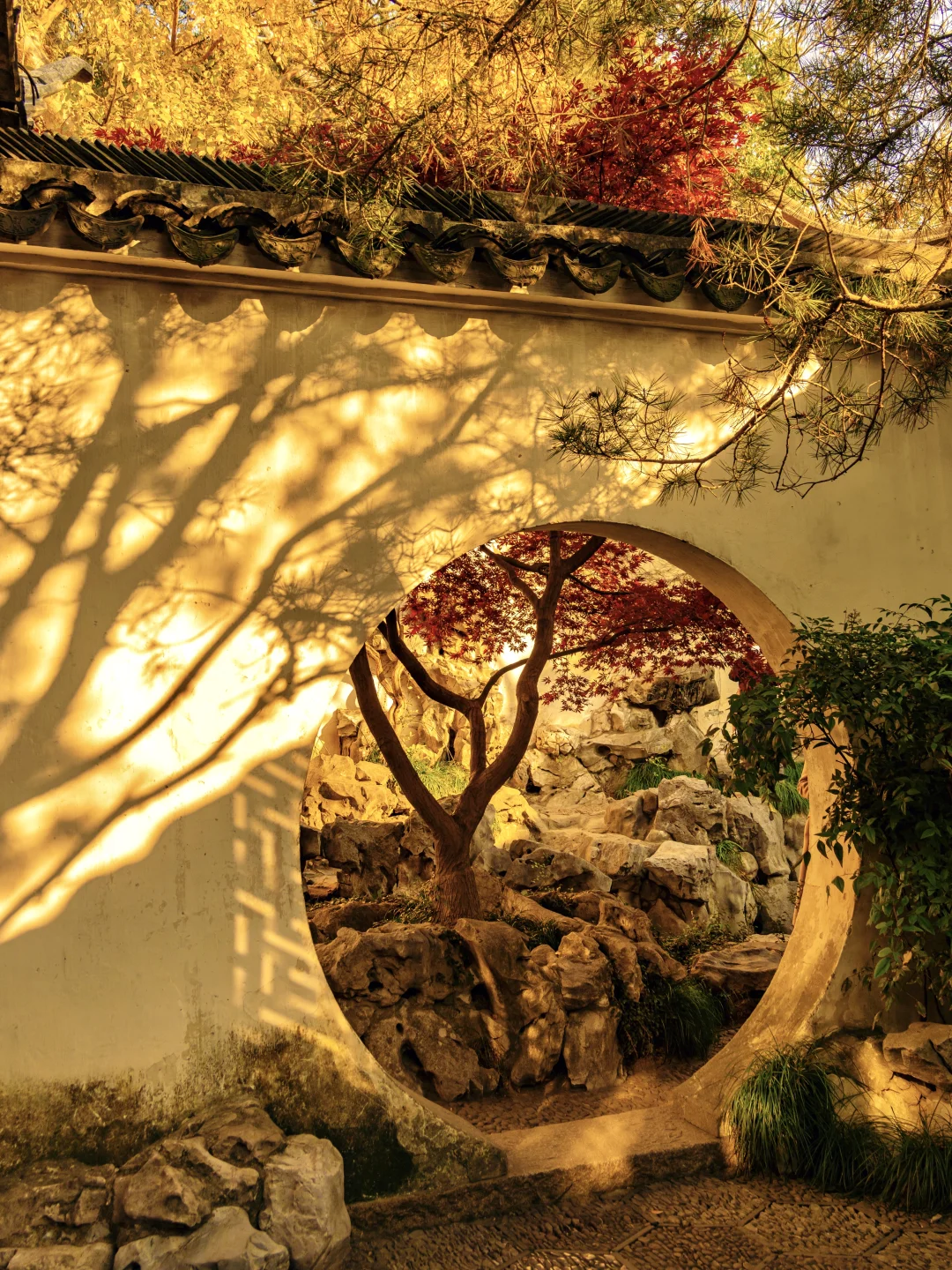 打卡《红楼梦》取景地,日落时分圆洞的流光跃金,背景刚好是一棵红枫,很是好看。这里离环秀山庄很近,可以安排一起游玩
