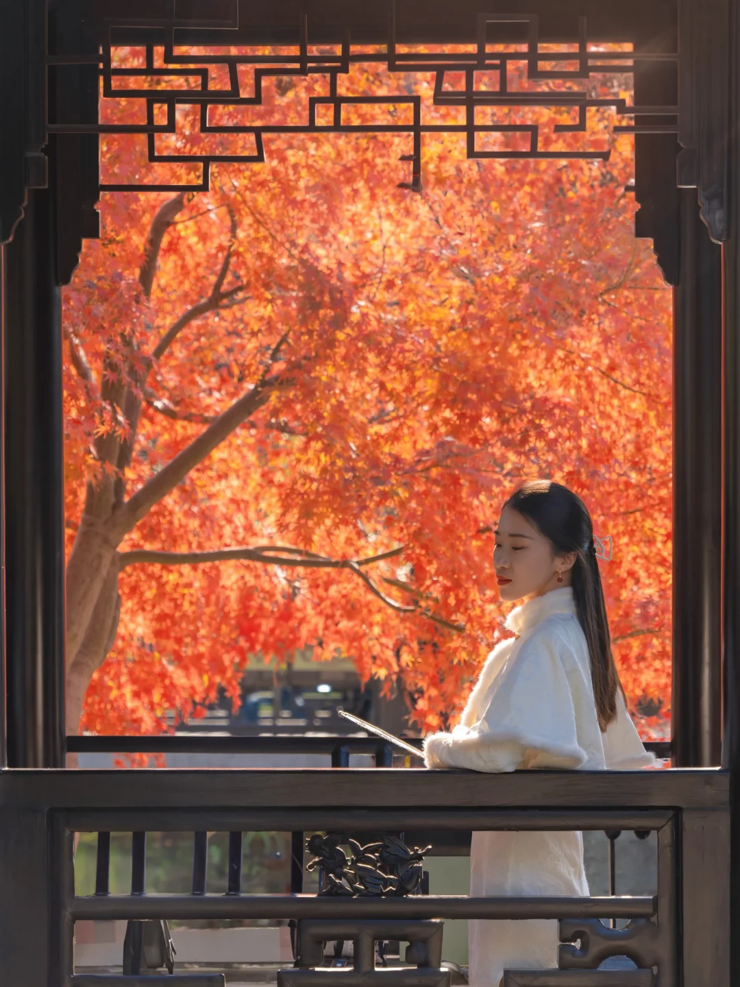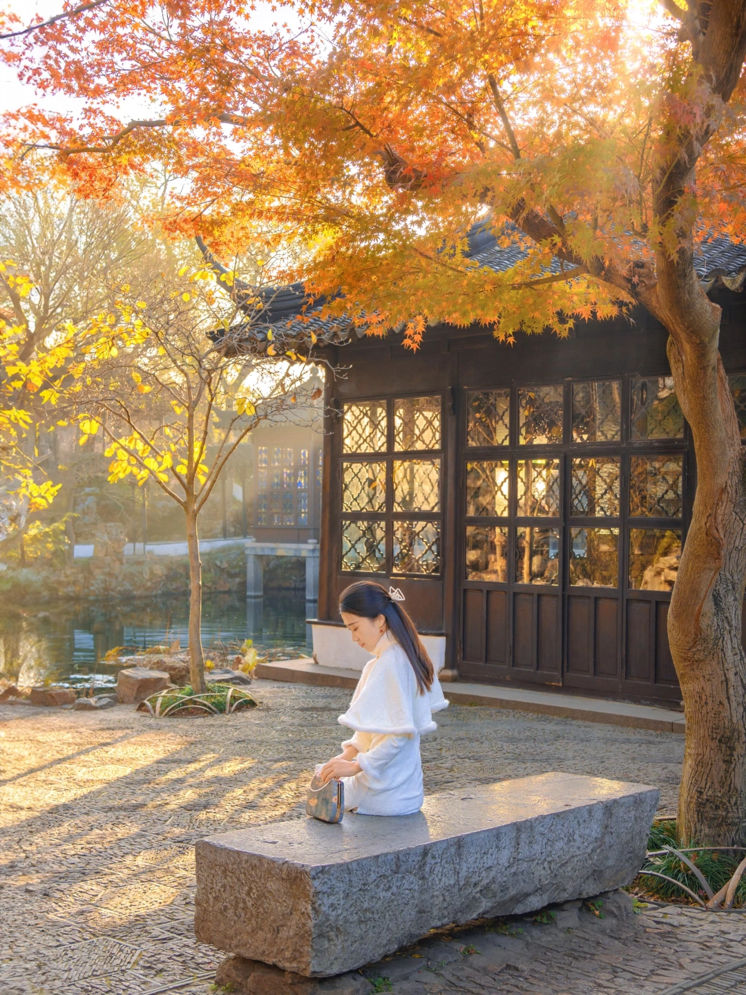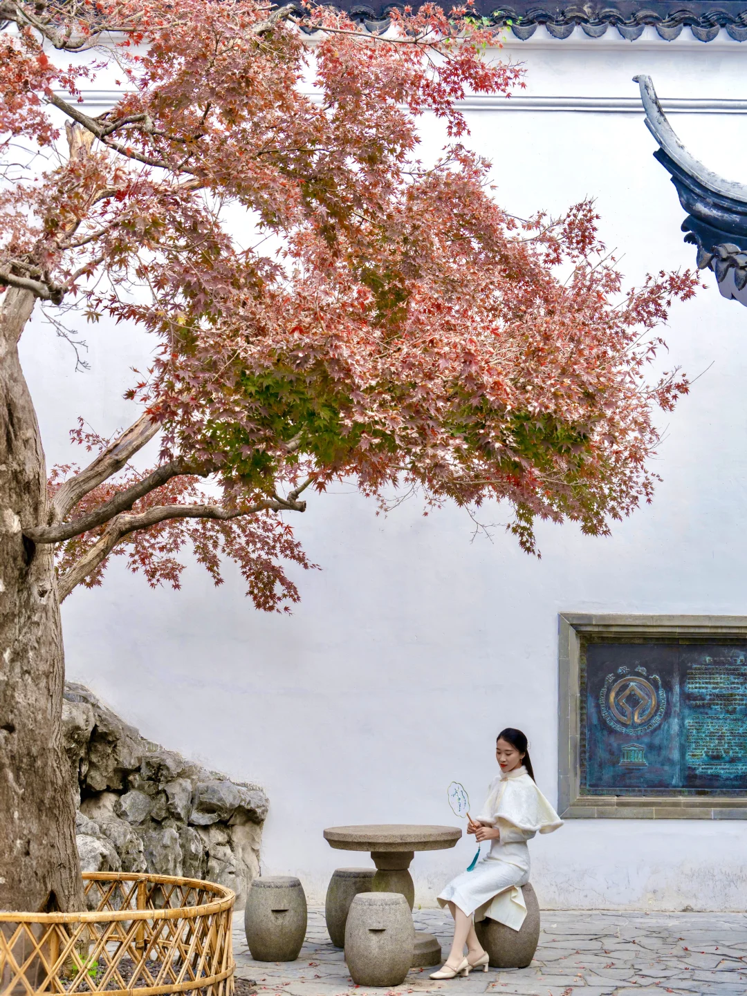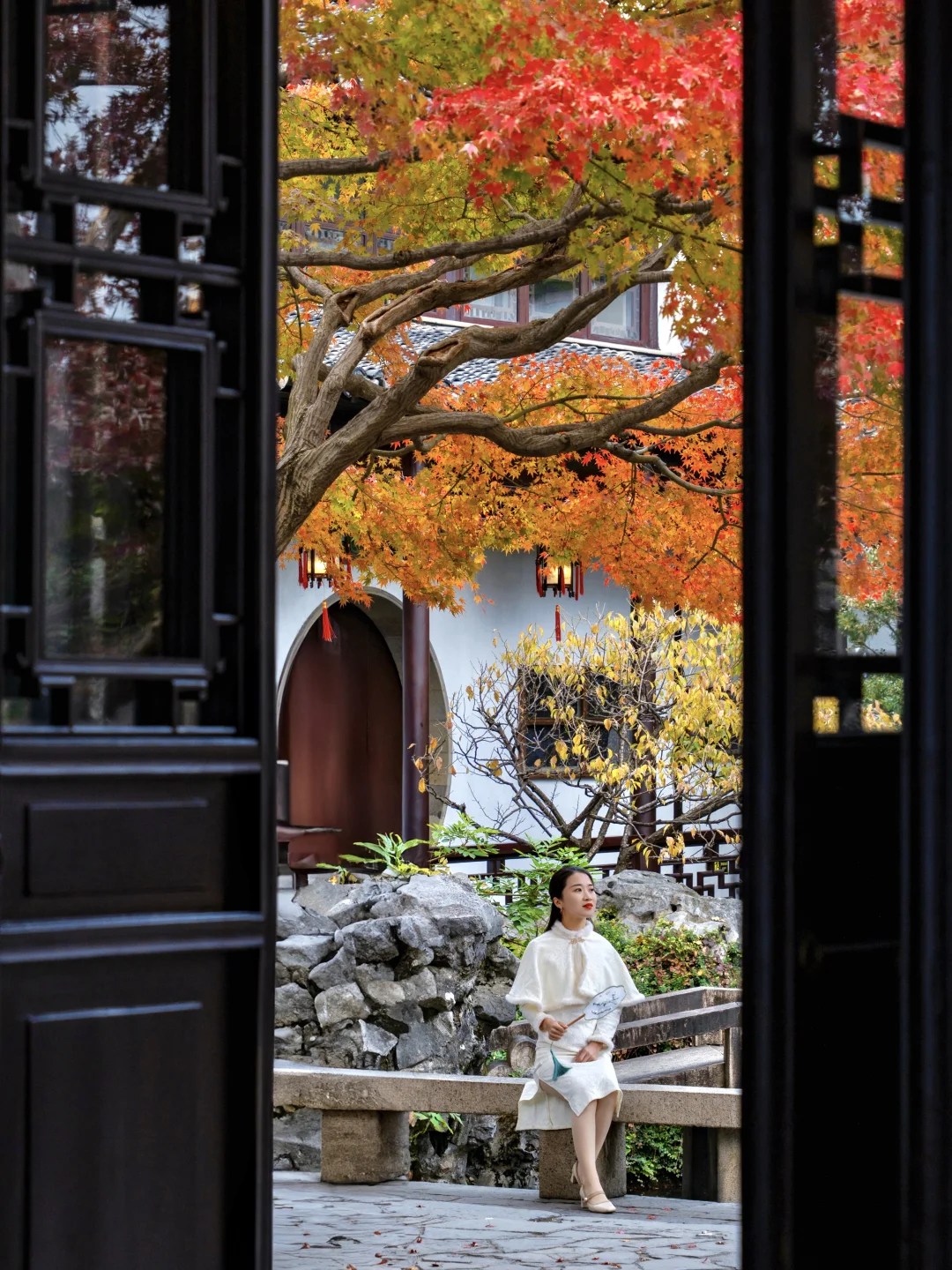打卡《红楼梦》取景地,日落时分圆洞的流光跃金,背景刚好是一棵红枫,很是好看。这里离环秀山庄很近,可以安排一起游玩