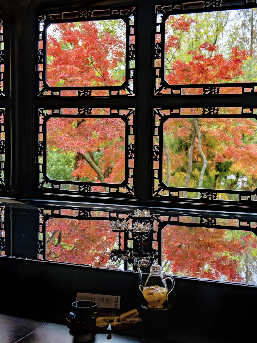 寒山寺里的咖啡店,二楼有琉璃光院同款窗景很有特色,11月底12初刚好最是橙黄橘绿时,像一幅流动的江南秋画