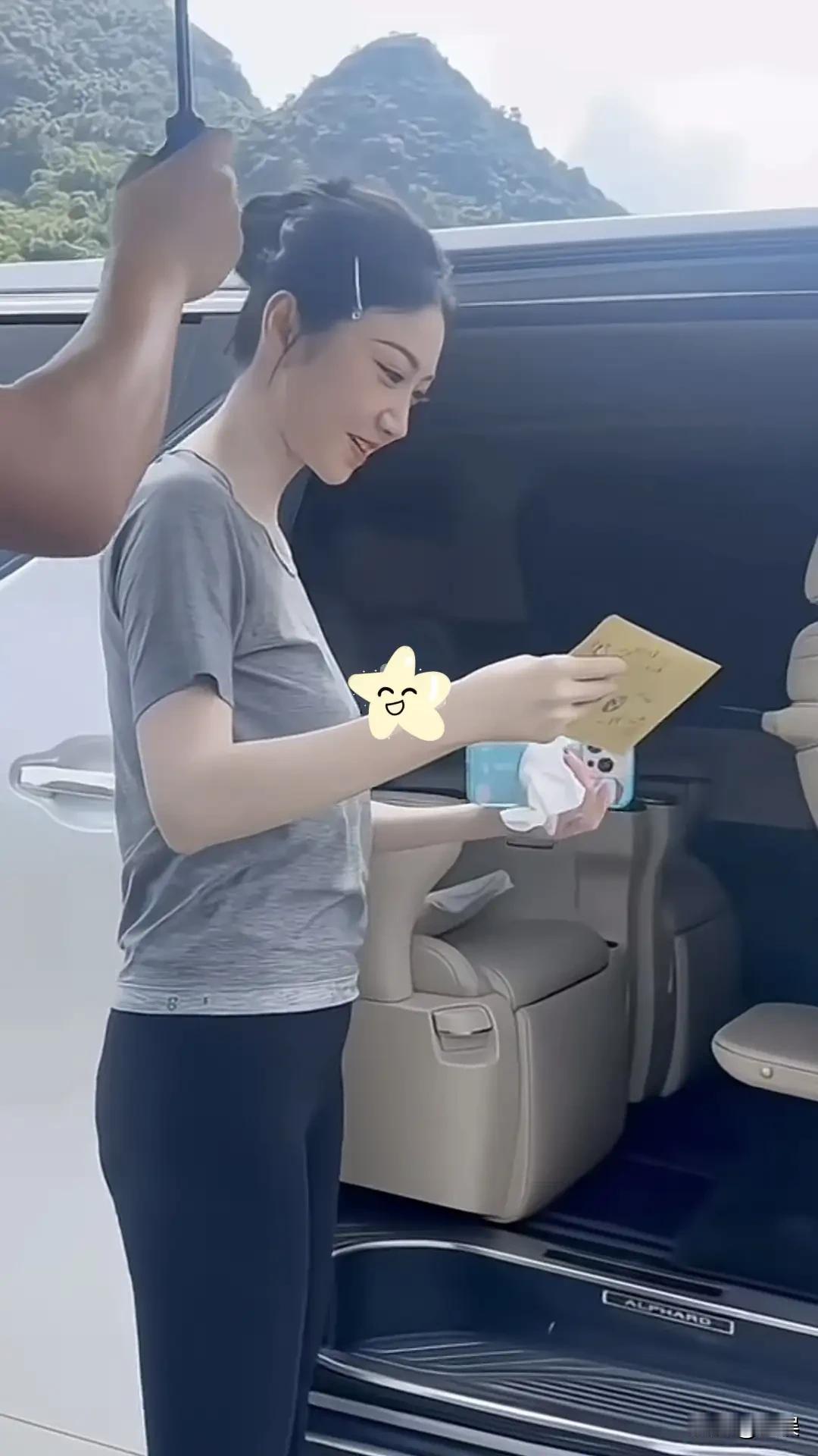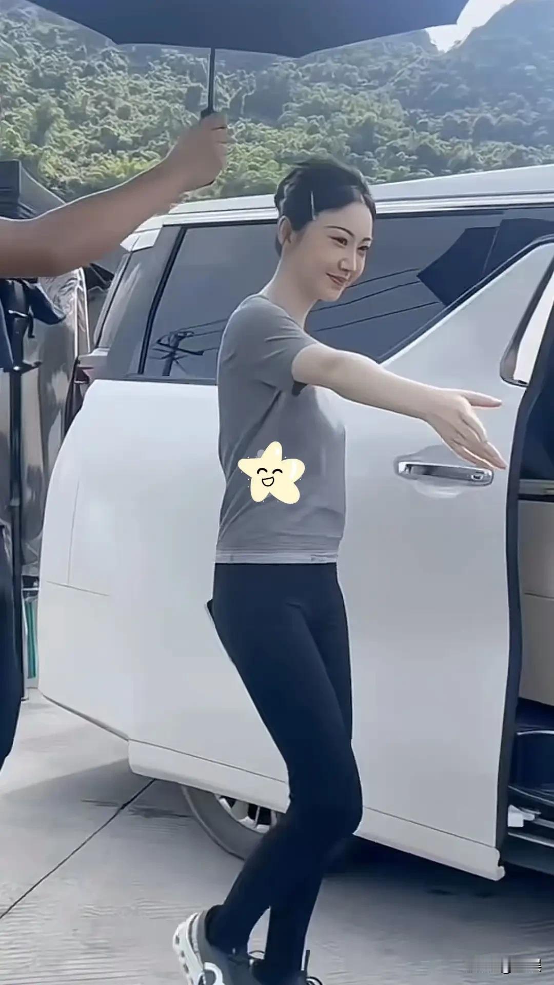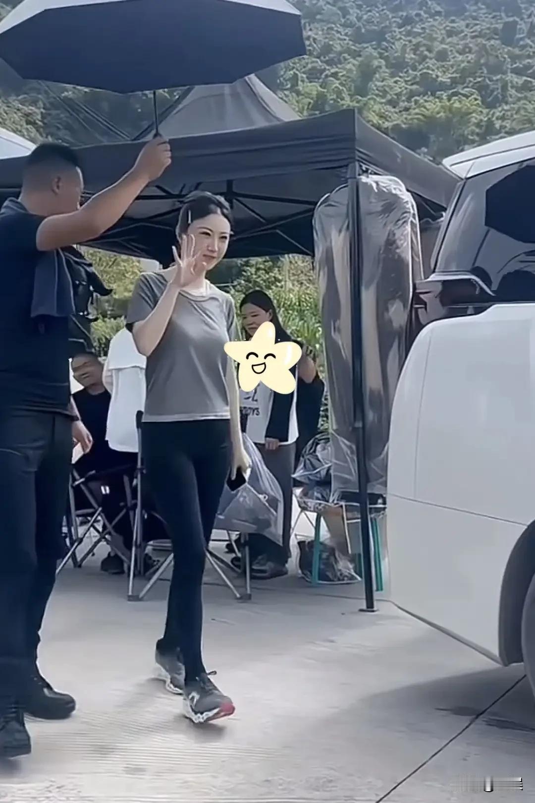 景甜户外浅灰短袖配黑色裤