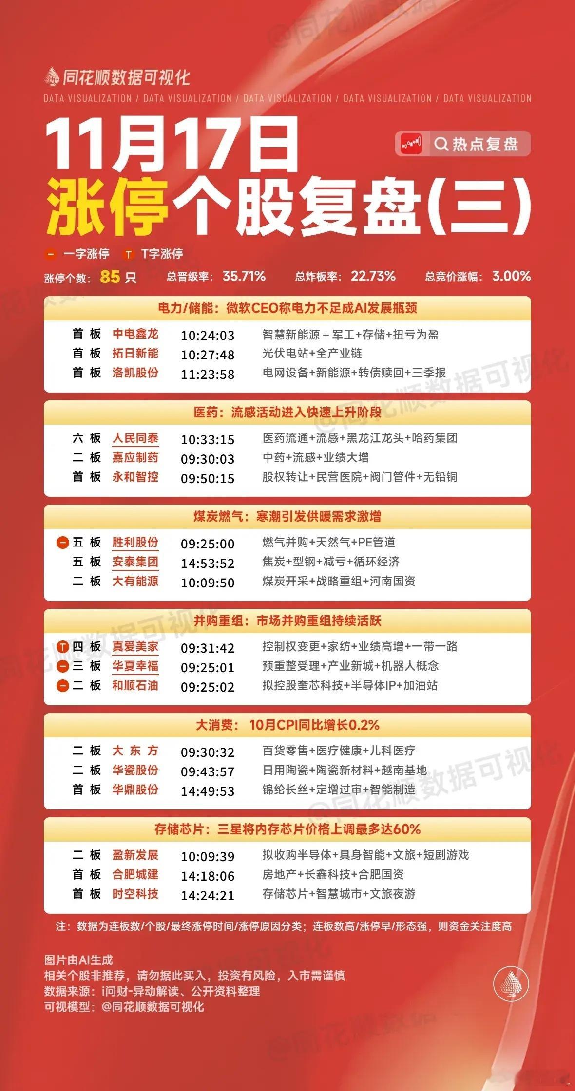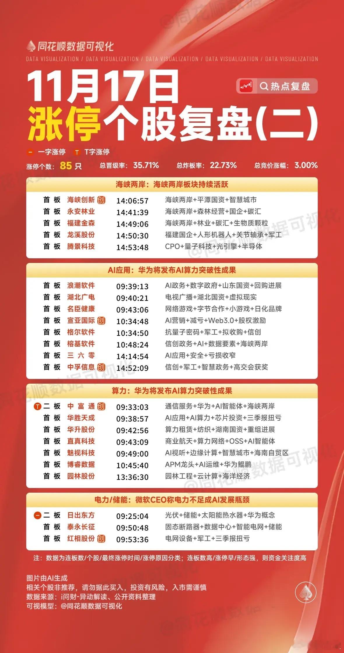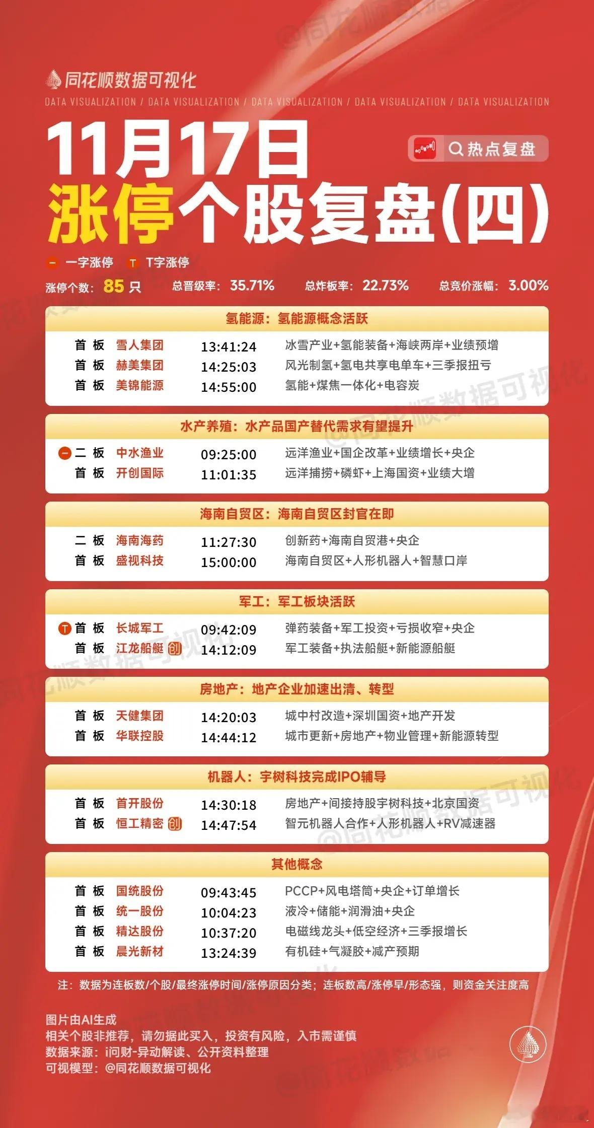 11月17日A股复盘:5只热门个股隔日走势深度解析1、孚日股份(锂电池概念)周末事件催化叠加VC涨价逻辑,孚日股份早盘竞价强势,毫无悬念顶开一字涨停,直接带动短线妖股情绪升温。不过,该股今日涨停后已触发严重异动,且与平潭发展一同进入重点监控名单参考此前合富、摩恩进入监控后同步断板的走势,孚日股份隔日大概率会受情绪传导。作为高位八连板标的,隔日竞价表现成为关键:若能继续强势顶死一字板,即便短线妖股存在分歧预期,仍有望吸引资金承接做多;但若竞价未能开出一字,短期回调风险将显著提升,其走势也直接关联整个短线情绪的延续性。2、长城军工(军工概念)受益于军工方向的强情绪发酵,龙洲股份、航天发展等前排标的大单一字封死,长城军工成为踏空资金的核心选择,竞价阶段便被顶至涨停价开盘,且开盘后快速封死涨停。盘中虽出现分歧放量,但承接资金力度强劲,不到3分钟便完成回封,最终走出缩量强势涨停走势。不过需注意,当前军工板块真正走出持续性的个股有限,今日硬顶更多是情绪驱动,持续性存疑;加之长城军工流通盘偏大,隔日连板难度较高。若龙洲股份、航天发展继续锁死一字不给机会,长城军工或可发挥中军作用,隔日高溢价基本确定;但一旦开盘未能强势封板,建议及时止盈离场,毕竟同题材的水产板块今日已出现多股炸板的分化信号。3、安泰集团(煤炭概念)作为前排标的中竞价表现最弱的一只,安泰集团微红开盘后,虽有资金快速拉升冲击涨停,但未触板便遭遇获利盘兑现,盘中一度逼近跌停。好在今日妖股情绪无明显负反馈,资金快速抄底介入,叠加煤炭板块整体走强,该股逐步趋势回升,高位横盘放量后尾盘封死涨停,走出近“天地天”的五连板行情。盘后龙虎榜显示,买盘以散户席位为主,卖盘则是短期获利游资离场,而陈小群未出现在卖盘,彰显龙头信仰。值得关注的是,该股今日再次触发200%严重异动,连续两个交易日两项异动的强度超过此前合富的表现。隔日走势与煤炭板块联动性极强:若板块效应延续,或无明显负反馈;但从形态来看,大概率存在大幅低开预期,能否弱转强完全依赖煤炭方向的持续加持,反之则可能面临资金集中兑现。4、三六零(AI应用概念)华为AI算力突破性成果的消息刺激下,AI方向迎来复苏,三六零在10月底首板后高位横盘10个交易日后,再度斩获首板涨停,成为AI应用方向的核心风向标。该股午后虽出现分歧炸板,但最终仍有资金承接封死涨停,放量走势凸显资金关注度。不过,目前尚未突破近期13.84元的高点,该价位将成为隔日强压力位。若竞价表现疲软,短期获利盘兑现概率较大;但考虑到今日AI板块整体回暖,三六零作为板块中军,有望吸引资金持续承接,即便难以走出连板走势,在AI方向不弱的前提下,大概率会延续趋势行情。5、雪人集团(冰雪产业概念)雪人集团午后强势拉升封板,板上短暂分歧后彻底锁死涨停,同时带动整个冰雪产业板块走强,自身也走出明确的突破型涨停走势。盘后龙虎榜表现亮眼,买盘包含4家游资席位及深股通,卖盘多为散户席位,与11月4日首次启动时的榜单特征相似。该股近期高位横盘洗筹充分,辨识度较高,隔日冲高溢价基本无忧。若冰雪产业板块延续热度,且竞价有资金主动引导,大概率会引发资金抢筹;尤其在高位妖股可能出现分歧的背景下,相对低位的雪人集团或成为资金切换的选择。不过,若想实现连板,隔日竞价必须展现出足够强度,否则可能仅以冲高兑现收场。
