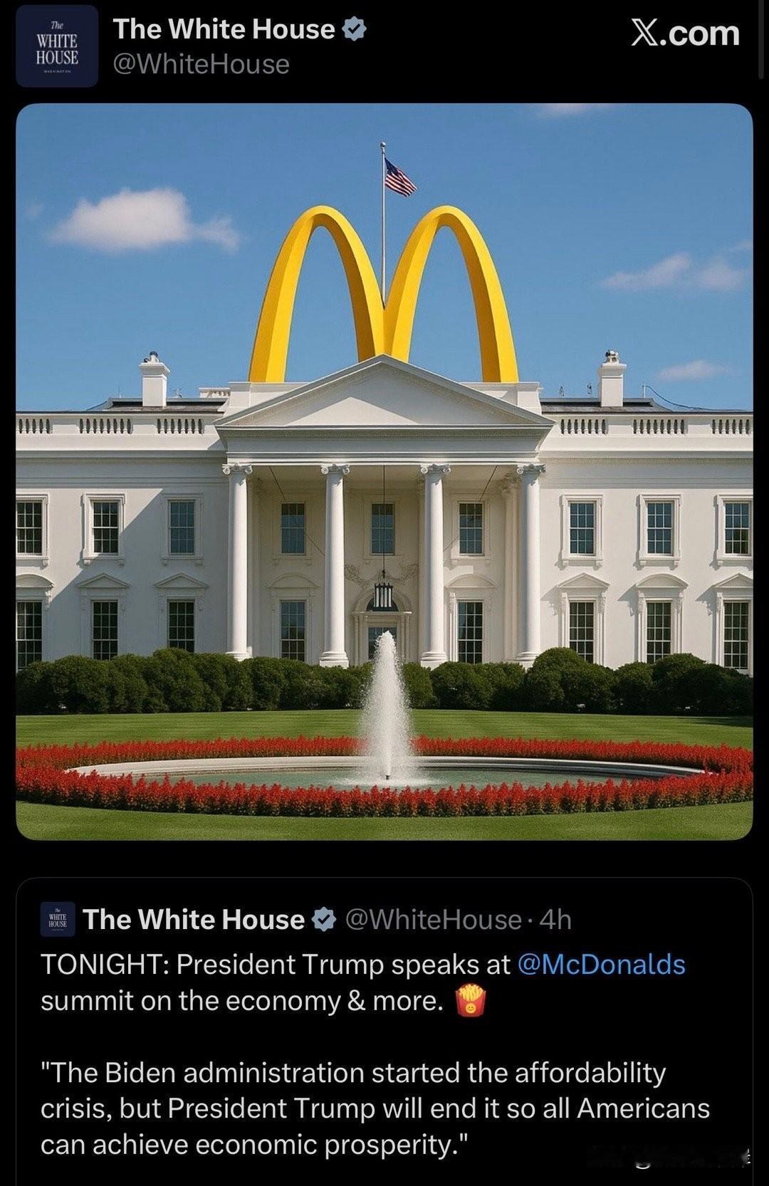 白宫官宣川普今晚将在@McDonalds 经济峰会等场合发表讲话。 “拜登政府引发了这场可负担性危机,但川普总统将结束它,让所有美国人都能实现经济繁荣。”