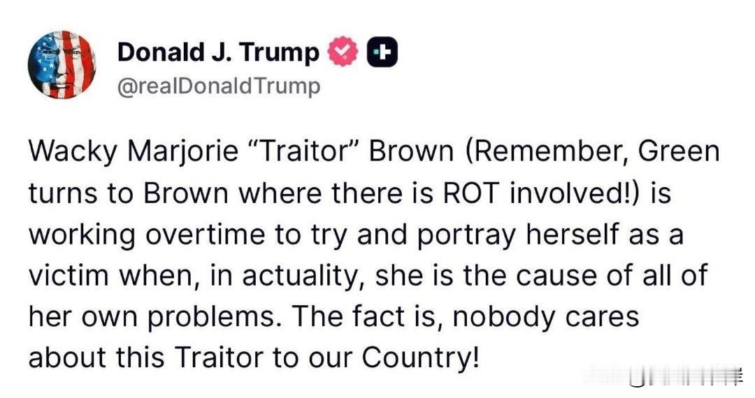 川普发文攻击Marjorie为叛徒。 “古怪的Marjorie‘叛徒’Brown(记住,绿色变成棕色的时候,就说明有腐烂了!)正在拼命把自己打扮成受害者,而实际上,她所有问题的根源就是她自己。事实是,根本没人关心这个国家的叛徒!”