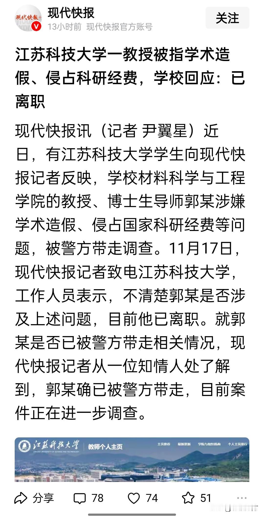 江苏科技大学一教授被指学术教假,据说真实学历只是高中毕业。说实话这种传闻我是不太相信的,“首席科学家”,“博士生导师”,纳米技术,以区区一名高中生就能做到,那此人无疑是一位天才。如果因为学历问题就身陷牢狱,那实在是人力资源的浪费。不过话说回来,是金子总会发光,这种牛人在坚苦的环境里也能有不小的成就吧。[笑哭]