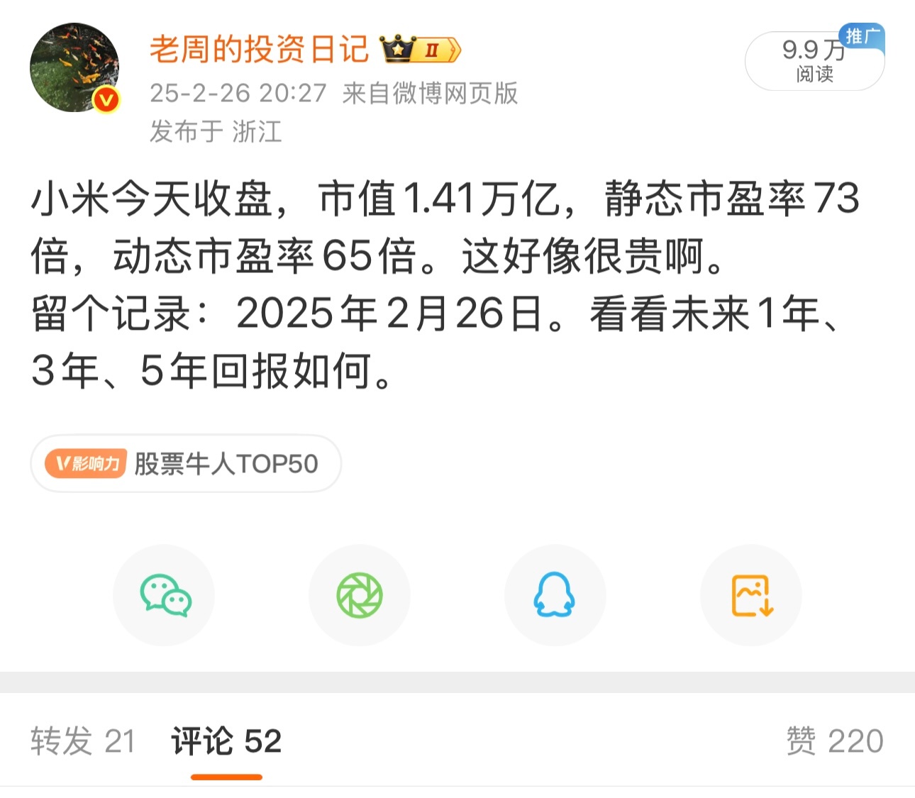 小米股价,今天又跌了,目前市值1.07万亿。老周在2月26日记录,当时小米市值1.41万亿。我说贵了。记录下来,看看未来回报如何。也就是说从 2月26日买入持有到现在的人,通通亏钱,逆势亏钱。投资不能追高买入。小米是家很牛的公司,但在2月26日市值就1.41万亿,与当时其它科技股或者互联网公司比,贵了。
