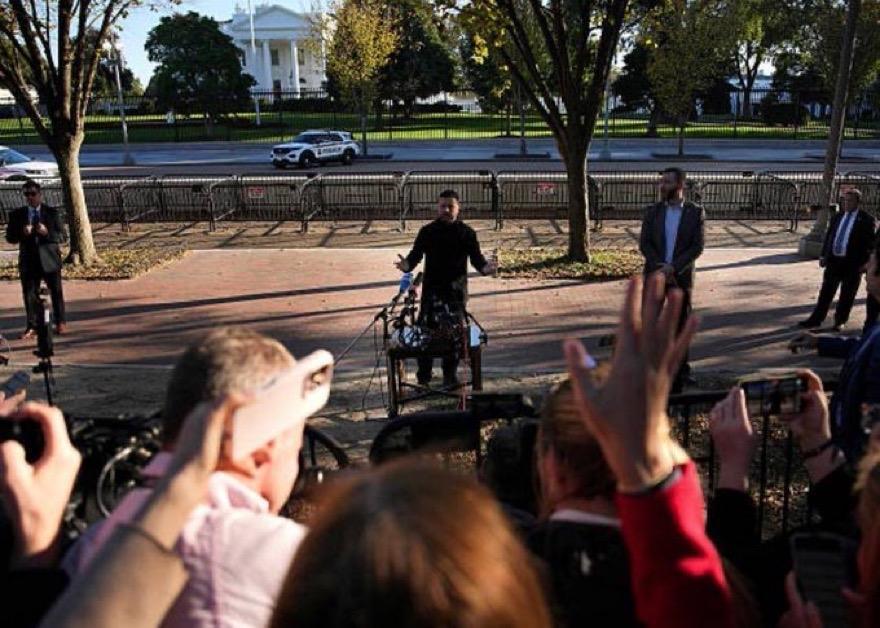 泽伦斯基在白宫马路对面的路边召开新闻发布会,他拒绝了川普的割地和平方案,川普禁止他在白宫草坪召开记者会。他于是不得不像个村长一样,来到马路对面搭个桌子召开记者会。 这张照片将载入史册!