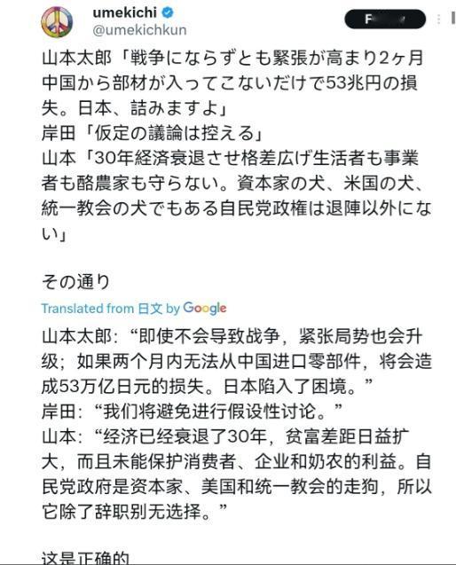 事情没那么简单!在我们呼吁其公民避免前往日本之后,日本明显感到事态正在扩大,日本议员,害怕我们进行关键物项管制,回击高市早苗!11月15日,日本议员山本太郎表示:即使没有战争,紧张局势也会加剧,如果两个月没有从中国进口零部件,我们将损失 53 万亿日元。日本将陷入麻烦。 麻烦看官老爷们右上角点击一下“关注”,方便您进行讨论和分享,感谢您的支持! 具体来说,日本的汽车和电子产业是最明显的例子。以丰田、本田为代表的日本车企,其混合动力汽车关键零部件几乎100%依赖中国供应。无论是电池的核心材料,还是电机、芯片等关键元件,都来自中国。 换句话说,中国不仅是日本的市场,更是日本制造业赖以生存的“零件库”。一旦供应链被切断,哪怕只是短短几周,日本的生产线就可能出现停滞,订单延迟,甚至整个产业链出现连锁反应。 山本太郎用“精益生产模式在政治紧张时期暴露脆弱性”来形容这个问题,并不是夸大其词。日本长期推行的精益生产模式,强调零库存、快速周转,一旦上游供应受阻,整个生产系统几乎没有缓冲空间,后果可以想象。 除了产业层面的风险,山本太郎还揭示了日本政治内部的矛盾。他指出,自民党一方面依赖与美国的军事合作,确保国家安全,另一方面在经济上又无法脱离中国市场的支持。这种看似平衡的策略实际上充满矛盾。 在对外政策上强硬,但经济上又脆弱,这种“夹心政策”不仅让日本企业面临巨大压力,也让普通家庭切身感受到风险。 比如,如果关键零部件断供,汽车价格可能上涨,电子产品供不应求,甚至一些基础生活用品也可能受影响。普通民众的生活成本将明显增加,社会的不满情绪也会因此积累。 值得注意的是,山本太郎的警告并非空穴来风。近年来,中日经济依存度持续升高,尤其是在高科技和制造业领域。 根据公开数据,中国已成为日本最大零部件进口国,尤其在电子、汽车、精密机械领域,几乎没有其他国家能够替代中国的供应能力。 日本一些中小企业更是深陷这种依赖中,它们的订单链条上游全部集中在中国,一旦政策或市场出现波动,企业几乎无力应对。 这种现实风险,山本太郎在议会发言中用直白的语言表达出来,试图提醒政府和民众:在外交言论和政治表态的背后,是普通民众和企业的切身利益。 同时,这一事件也反映出全球供应链格局在地缘政治冲突下的脆弱性。过去,日本制造业以高效率、精细化管理著称,但这种模式在全球局势紧张时却成为软肋。 简单来说,精益生产虽然让企业在平稳时期利润最大化,但缺乏抗风险能力。一旦上游供应中断,停工、延迟、库存不足就会立刻显现。这不仅是经济问题,更是社会问题,因为经济动荡最终会传导到普通家庭的生活中,影响就业、消费和生活成本。 除了经济层面,山本太郎还指出,日本社会内部的矛盾正在加剧。自民党在安全和外交上采取强硬立场,但经济上仍深度依赖中国市场,这种表里不一的政策导致社会财富分配不均、贫富差距扩大。 企业和资本集团可能在短期内获益,但中小企业和普通家庭面临的压力更大。 山本太郎的发言在日本国内引起广泛关注和讨论,很多评论指出,这其实是对政府长期政策盲点的一种警告:国家安全与经济安全需要同步考虑,否则即便没有战争,社会稳定也可能受到冲击。 与此同时,国际社会也在密切关注这一动态。中日之间虽然有政治摩擦,但经济联系紧密到难以割舍。尤其是在高科技、汽车和电子制造领域,中国是不可替代的供应方。任何试图在短期内通过政治手段切断这种联系的行为,都可能造成双方经济上的巨大震荡。 换句话说,中日经济关系不仅仅是贸易数字上的往来,更是两国社会稳定和企业生存的命脉所在。山本太郎提出的“53万亿日元损失”警告,并不是夸张,而是用数字具体呈现了政治言论可能带来的现实后果。 更有意思的是,这一事件也折射出日本在全球战略布局中的困境。长期以来,日本在经济上高度依赖出口和制造业,尤其是对中国的出口和零部件进口。而在安全上又与美国紧密绑定,需要保持对美军事承诺。 这种两头受制的局面,使得日本在外交政策上显得小心翼翼,却在经济安全上潜藏风险。一旦供应链中断,影响的不仅是企业利润,更是整个社会的运转。山本太郎的表态,恰恰揭示了这种战略困境:经济独立性不足,政治表态却强硬,结果容易引发连锁反应。 在普通民众层面,这种依赖性同样明显。汽车、家电、电子产品,这些日常生活中不可或缺的物品,背后都是复杂的供应链。一旦核心零部件出现短缺,产品价格必然上涨,部分商品甚至可能出现短缺。 长期来看,这会直接影响民生,拉大贫富差距,增加社会不满情绪。山本太郎特别指出,政府在制定政策和表态时,需要充分考虑普通民众的利益,而不是只关注国际政治表演或企业高层的利润。