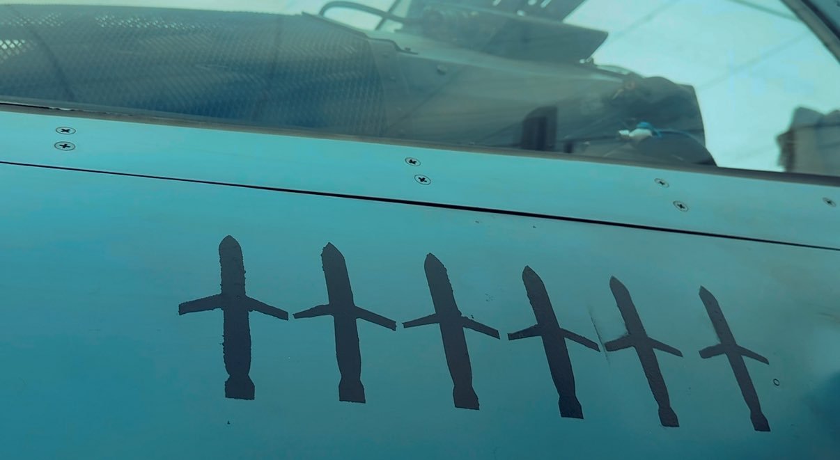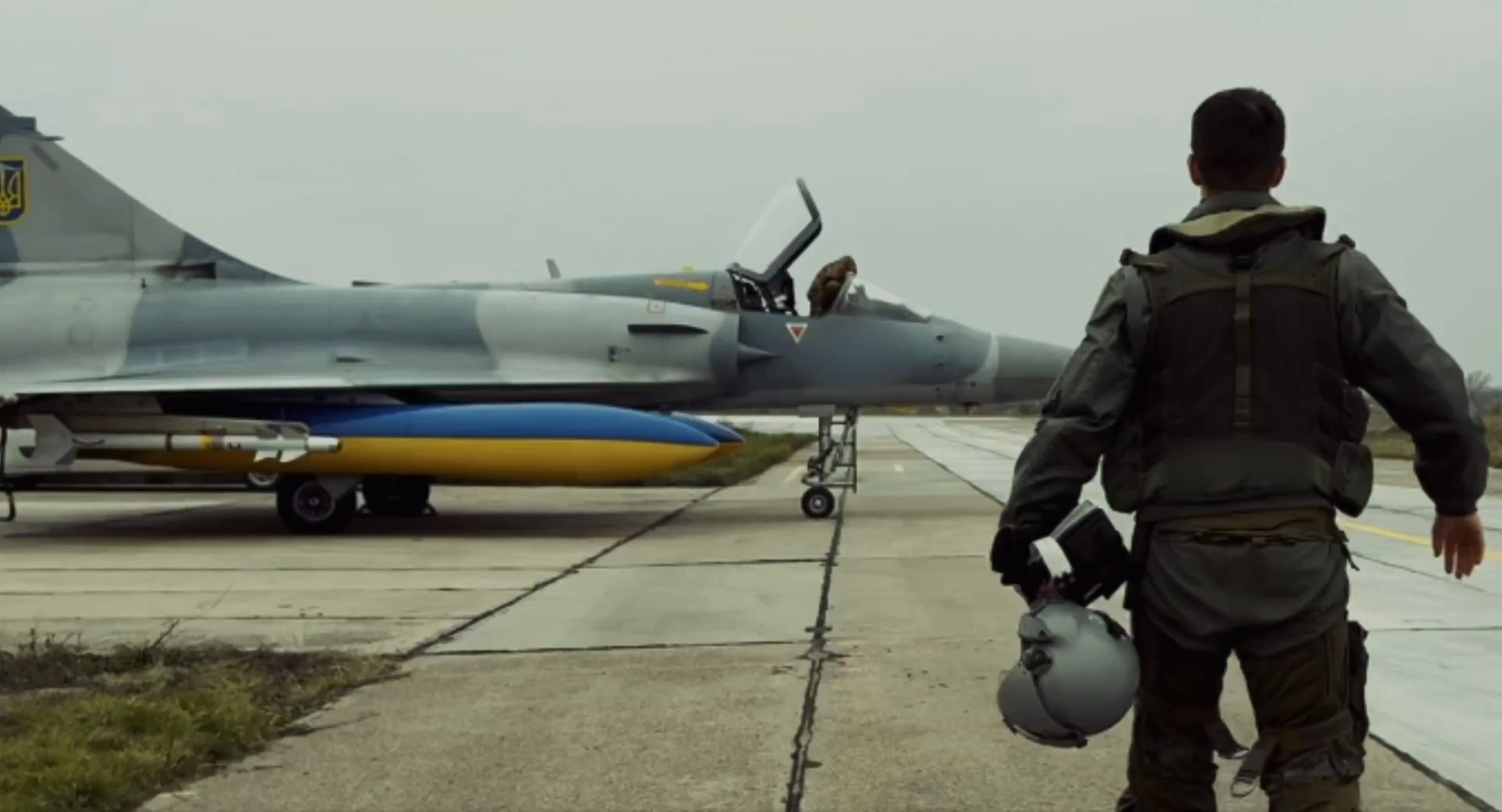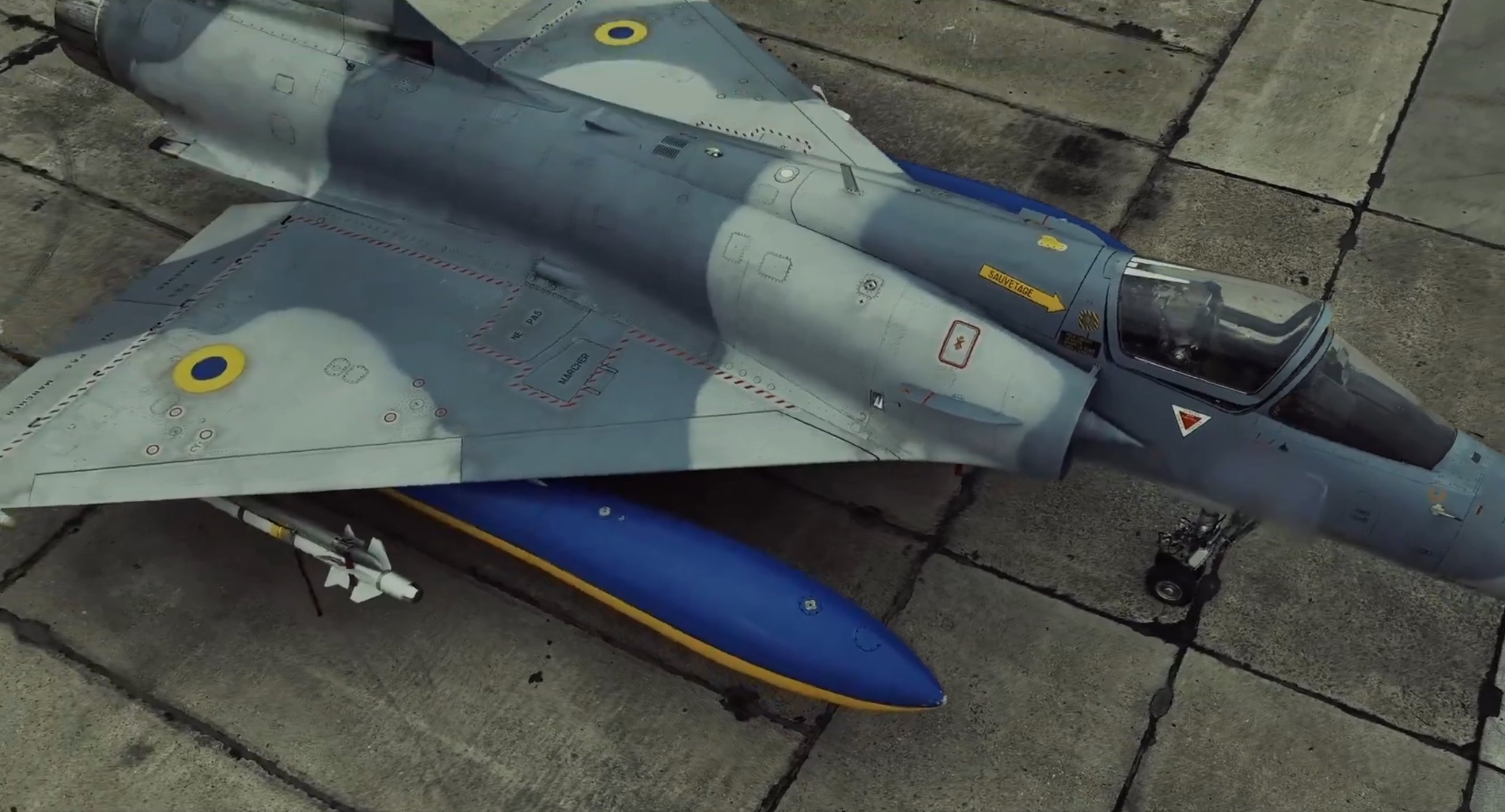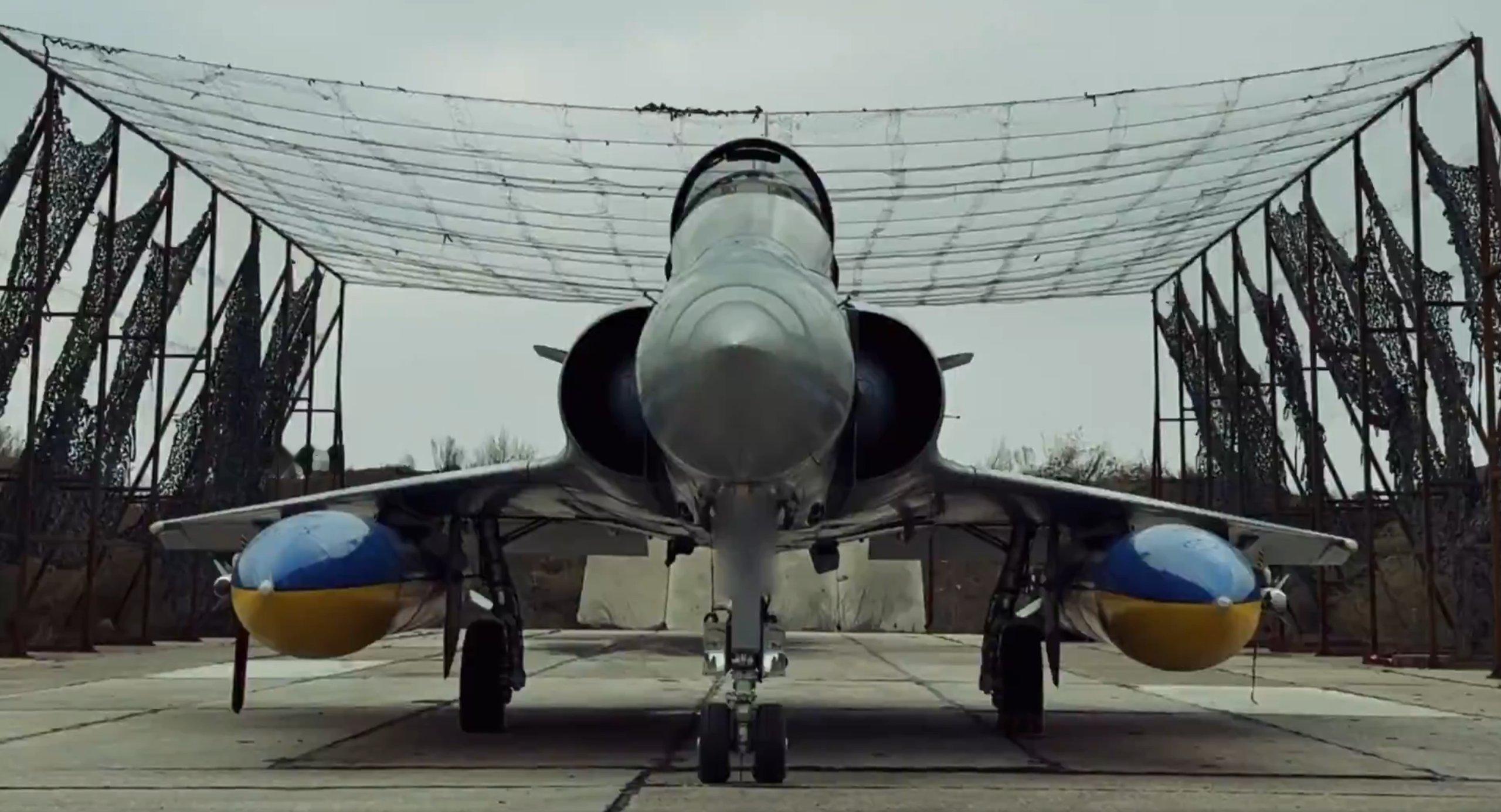 一架乌克兰空军的法制幻影2000-5F战斗机,挂载RPL 541/542 2000升副油箱*2,R.550近程空对空导弹*2,座舱下方绘有6个俄制Kh101巡航导弹击坠标志。