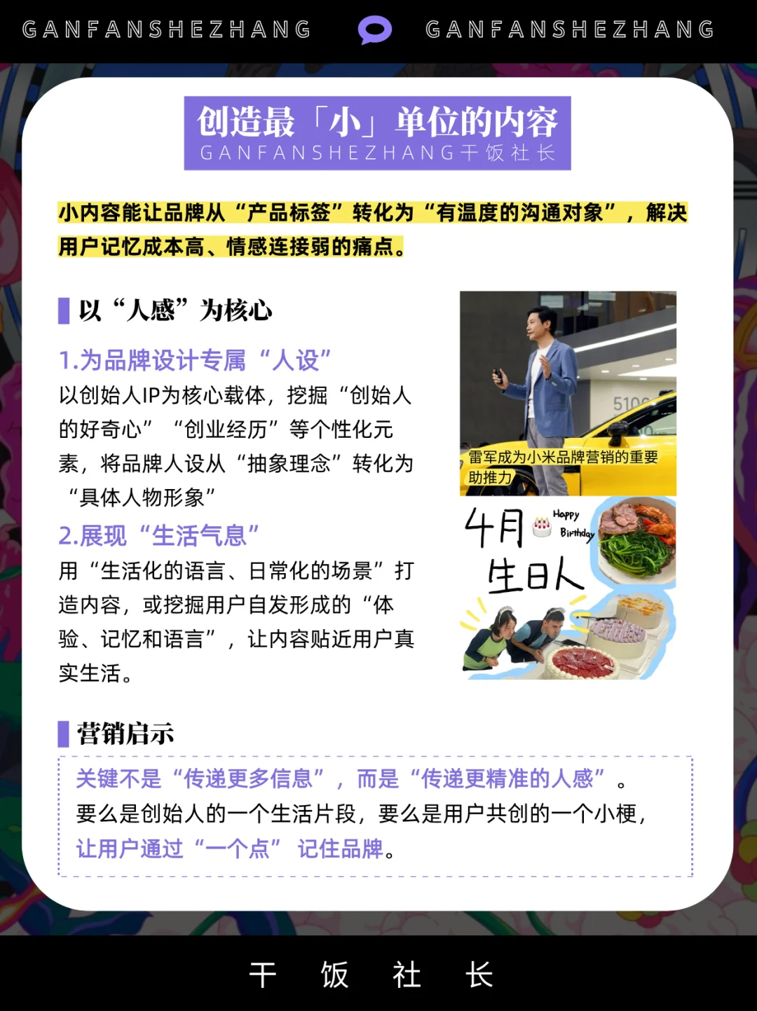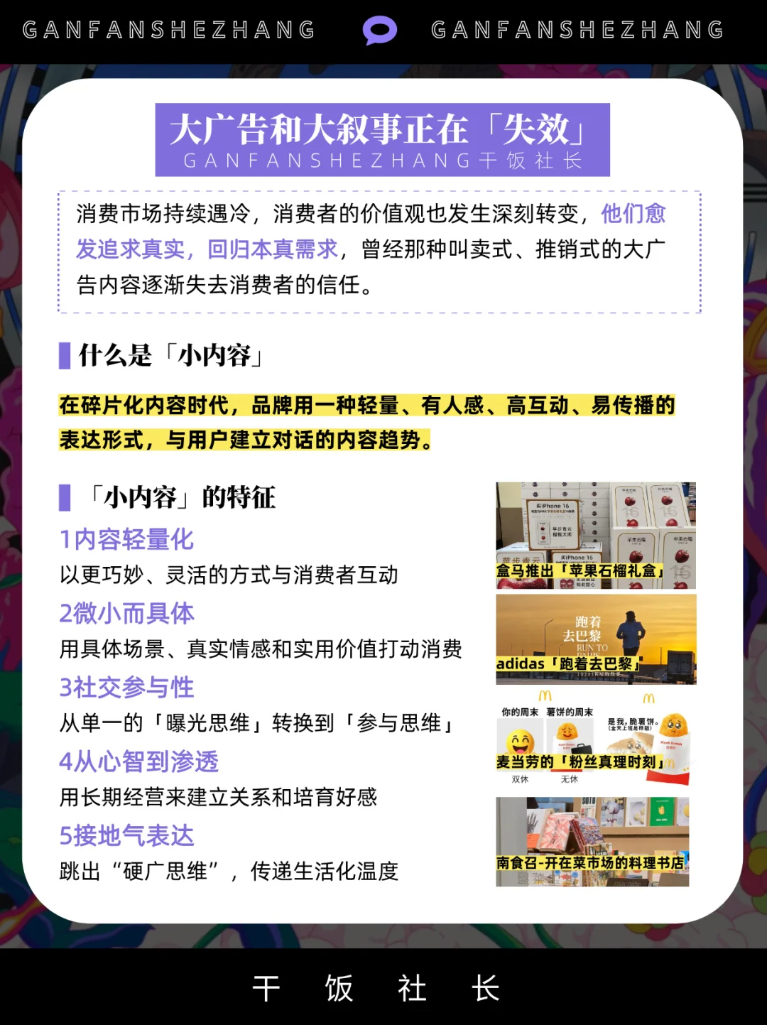 在内容碎片化、受众圈层化的时代下 传统大广告模式效果减弱 消费者更倾向于真实、具体的内容 品牌需适应媒介形态重构 与消费者主权时代的情绪共振 “小内容”以轻量、生动、高互动、易传播为特点 通过日常化场景构建与用户建立持久关系 能够更高效、且更好地 与用户实现日常的沟通和链接 本期就小内容趋势报告进行深度拆解 看看「小内容」时代品牌们 究竟应该如何链接消费者?