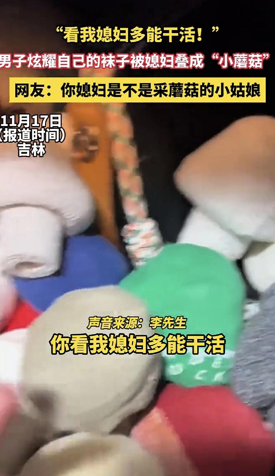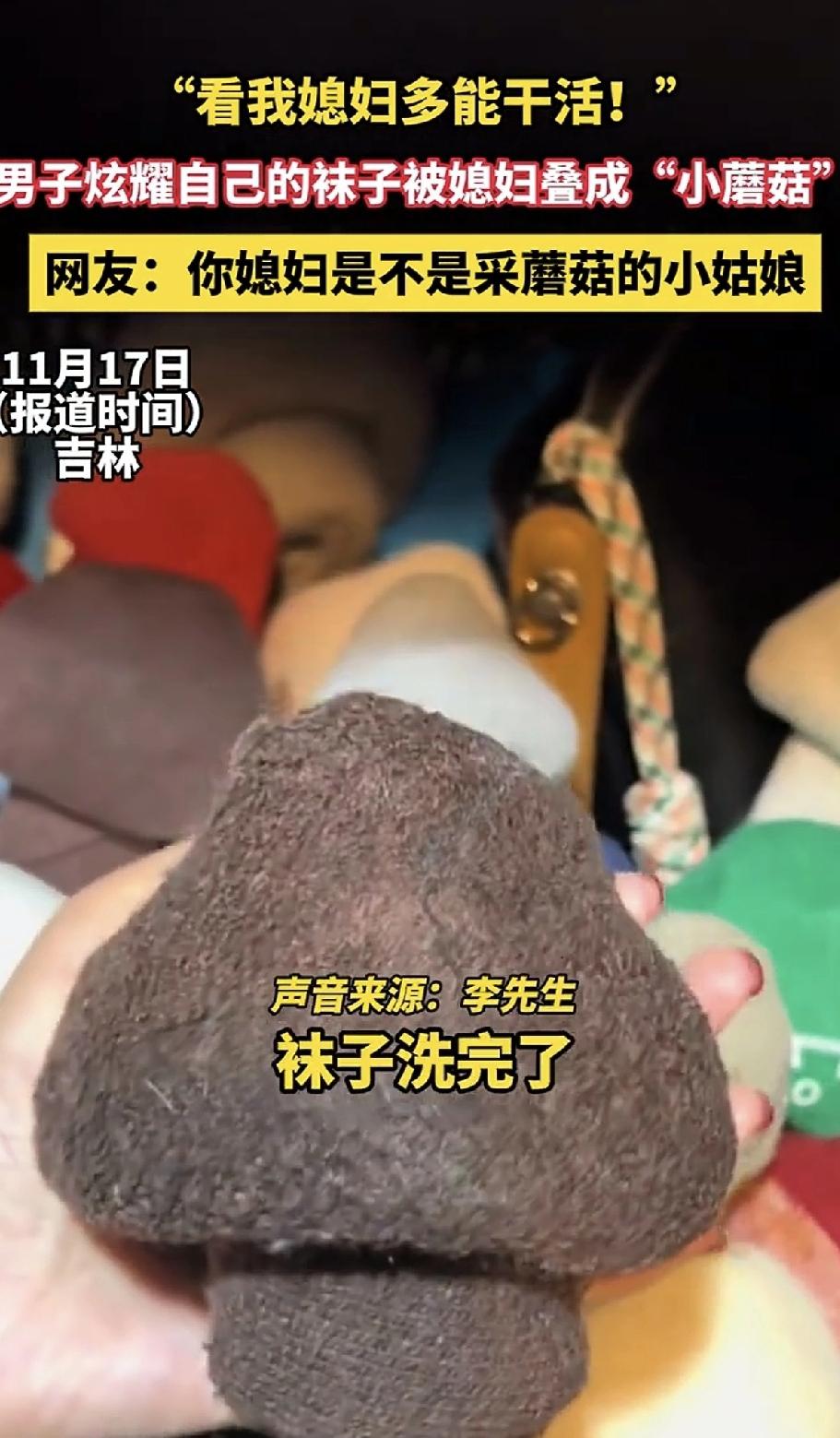 男子晒媳妇给叠的 “蘑菇袜子” 秀恩爱,评论区说啥的都有,但是叠法居然超容易? 山东一男子下班回家,发现媳妇把他的袜子全都叠成了小巧的蘑菇形状,“蘑菇”有大有小甚是可爱。 他觉得又可爱又暖心,随手拍了视频发上网,配文 “有媳妇就是好,连袜子都给叠成蘑菇”。 视频里,每只袜子都被精心整理,袜口朝上做成蘑菇伞的样子,袜身鼓鼓的像伞柄,确实看着很讨喜。 没想到评论区五花八门的说什么的都有,有人说:“这是秀恩爱天花板吧,我家那位能把袜子洗干净就不错了”; 还有人觉得:“是不是媳妇没事干?与其花时间叠袜子,不如多休息会儿”; 但是更多的是觉得这样包袜子太可爱了,求作者怎么包的。其实这叠法超简单,教程安排上! 先把袜子铺平,从袜口往外卷到袜尖的位置,整理一下形状,形成蘑菇伞的形状。 再把另一只袜子平着卷起来,卷成一个圆柱形,塞进刚才做好的蘑菇伞里就做好啦!全程不到 30 秒,手残党也能轻松学会。 这就是生活中的小确幸啊!生活里真的需要这样小小的仪式感,看似不起眼的小举动,却藏着满满的心意和趣味。 那些让人觉得好玩又暖心的小事,其实都藏在日常里的温柔。你的生活里有没有类似的小仪式感?