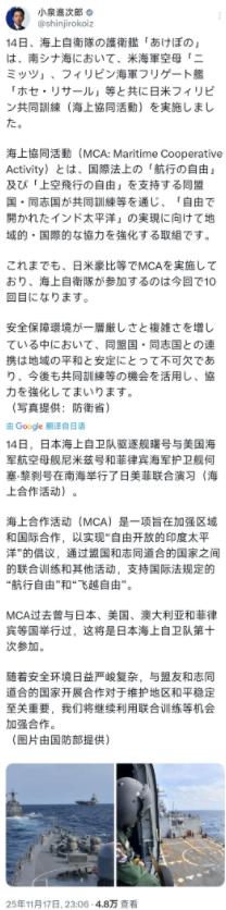 日本防卫大臣小泉进次郎昨晚(11月17日晚)发文写道:“14日,日本海上自卫队驱逐舰曙号与美国海军航空母舰尼米兹号和菲律宾海军护卫舰何塞·黎刹号在南海举行了日美菲联合演习(海上合作活动)。 说白了,就是想跟着美国大哥刷存在感,顺便给菲律宾撑腰打气。这次演习名义上是"海上合作活动",实际上就是想在中国家门口秀肌肉,试探一下咱们的底线。 美国这些年一直想在南海搞事,拉拢日本和菲律宾当马前卒,这次演习就是他们精心策划的一出戏。 日本海上自卫队的曙号驱逐舰可不是普通军舰,这玩意儿装备先进,战斗力不俗,派它来南海明显是故意挑事。 美国尼米兹号航母更是老面孔了,三天两头在南海晃悠,这次拉上日本和菲律宾,就是想搞个"三国同盟"的假象。 菲律宾的何塞·黎刹号护卫舰虽然吨位不大,但地理位置特殊,成了美国拉拢的重点对象。三国军舰在南海碰头,又是搞战术演练,又是搞通信协同,摆明了就是想告诉中国:这片海域我们说了算。 可他们也不想想,南海自古以来就是中国的领海,中国在这儿的主权和权益不容侵犯。日本作为二战战败国,本该安分守己,现在却跟着美国在南海耀武扬威,这哪里还有半点战败国的样子? 更可笑的是,日本一边喊着要"和平发展",一边却不断扩大军备,积极参与海外军事行动。这次南海演习就是日本军事扩张的又一个信号。 小泉进次郎作为防卫大臣,不但不反思历史,反而主动配合美国的印太战略,这种做法简直是在玩火。 美国在南海搞军事演习,名义上是维护"航行自由",实际上就是想控制这条重要的海上通道。南海每年有三分之一的国际贸易经过这里,美国早就眼红了。 现在拉上日本和菲律宾一起搞事,就是想形成对中国的包围圈。日本也不想想,跟着美国瞎折腾,最后吃亏的还是自己。 中国经济体量这么大,日本很多企业都靠中国市场吃饭,真把中国惹急了,日本经济肯定要遭殃。菲律宾更该清醒点,跟着美国和日本在南海挑衅中国,最后只会落得个里外不是人的下场。 中国对南海的主权有充分的历史和法理依据,这点国际社会都清楚。日本和美国现在搞的这些小动作,根本改变不了南海属于中国的事实。 中国海军这些年发展很快,航母、驱逐舰、核潜艇一样不少,真要在南海干起来,日本和美国未必占得到便宜。小泉进次郎这次高调宣布演习消息,就是想向美国表忠心,显示日本在印太地区的"重要作用"。 可这种狐假虎威的做法,只会让日本在国际上越来越孤立。中国早就说过,南海问题应该由直接当事国通过谈判解决,域外国家无权干涉。 日本现在跳出来搅局,就是想破坏地区的和平稳定。这次演习虽然规模不大,但象征意义很恶劣。 三国军舰在南海碰头,就是想挑战中国的底线。中国军队早就做好了准备,任何挑衅行为都会遭到坚决反击。日本如果真想维护地区和平,就应该停止这种危险的军事活动,回到对话协商的正确轨道上来。 美国现在国内问题一大堆,却还在海外到处惹事,这种做法迟早要栽跟头。日本跟着美国瞎混,最后只会被当枪使。菲律宾更应该明白,和中国作对没有好下场,毕竟两国是近邻,合则两利,斗则俱伤。 南海的和平稳定需要地区国家共同维护,而不是靠外部势力指手画脚。日本这次参与南海演习,暴露了其右翼势力的野心。 他们不甘心只做经济大国,还想恢复军事大国的地位。这种想法很危险,不仅会伤害邻国感情,还会把日本推向战争的边缘。 中国对日本的一举一动都看在眼里,任何危害中国主权和安全的行为,中国都会坚决回击。小泉进次郎以为拉上美国和菲律宾就能在南海为所欲为,这种想法太天真了。中国有信心、有能力捍卫自己的领土完整,任何挑衅都是徒劳的。 日本现在最该做的是深刻反省历史,而不是跟着美国到处惹是生非。如果日本一意孤行,继续在南海搞小动作,只会让自己陷入更加孤立的境地。 中国早就不是百年前的中国了,日本最好认清现实,不要在错误的道路上越走越远。南海的和平稳定不容破坏,中国会采取一切必要措施,维护自己的正当权益。 日本和美国这次在南海的演习,只会让地区局势更加紧张,最终损害的是所有国家的利益。希望日本能悬崖勒马,不要为了一己私利,破坏地区的和平与稳定。 中国始终主张通过和平方式解决争端,但也绝不会放弃使用武力维护主权。日本如果真想为地区和平做贡献,就应该停止这种危险的军事挑衅,回到对话合作的正确道路上来。否则,等待日本的只能是更加严厉的反击。